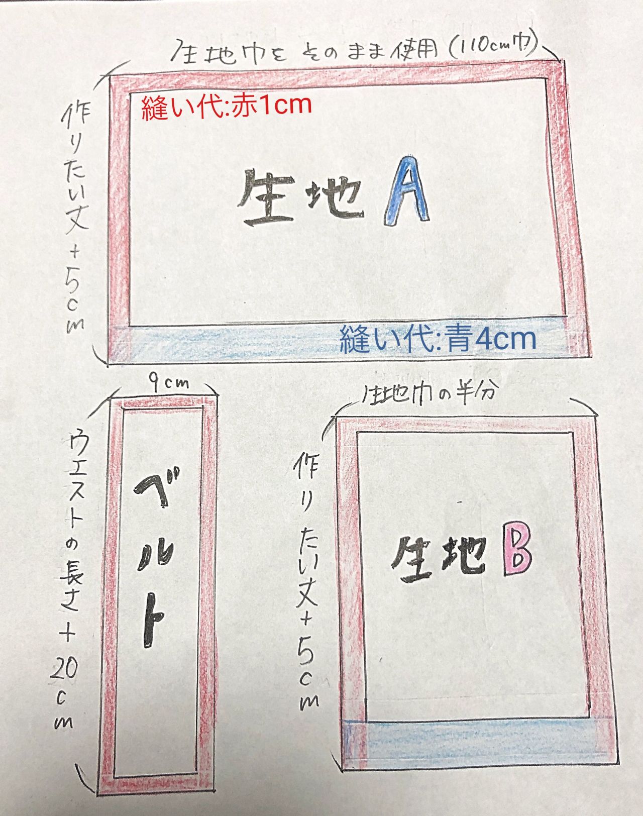 ・生地A(前後の生地)→作りたい丈の2倍+縫い代とベルト分20cm