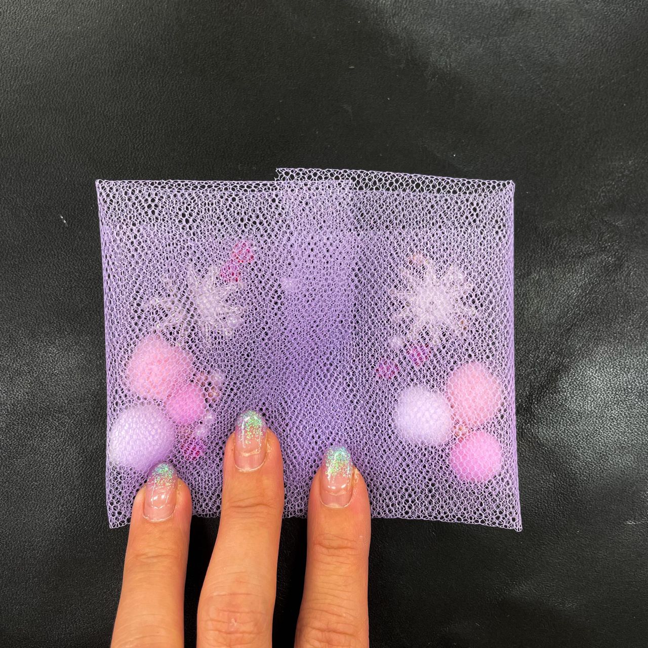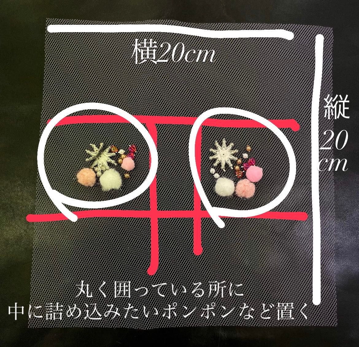 ①正方形にカットしたチュールの上に入れたいポンポン等置きます。