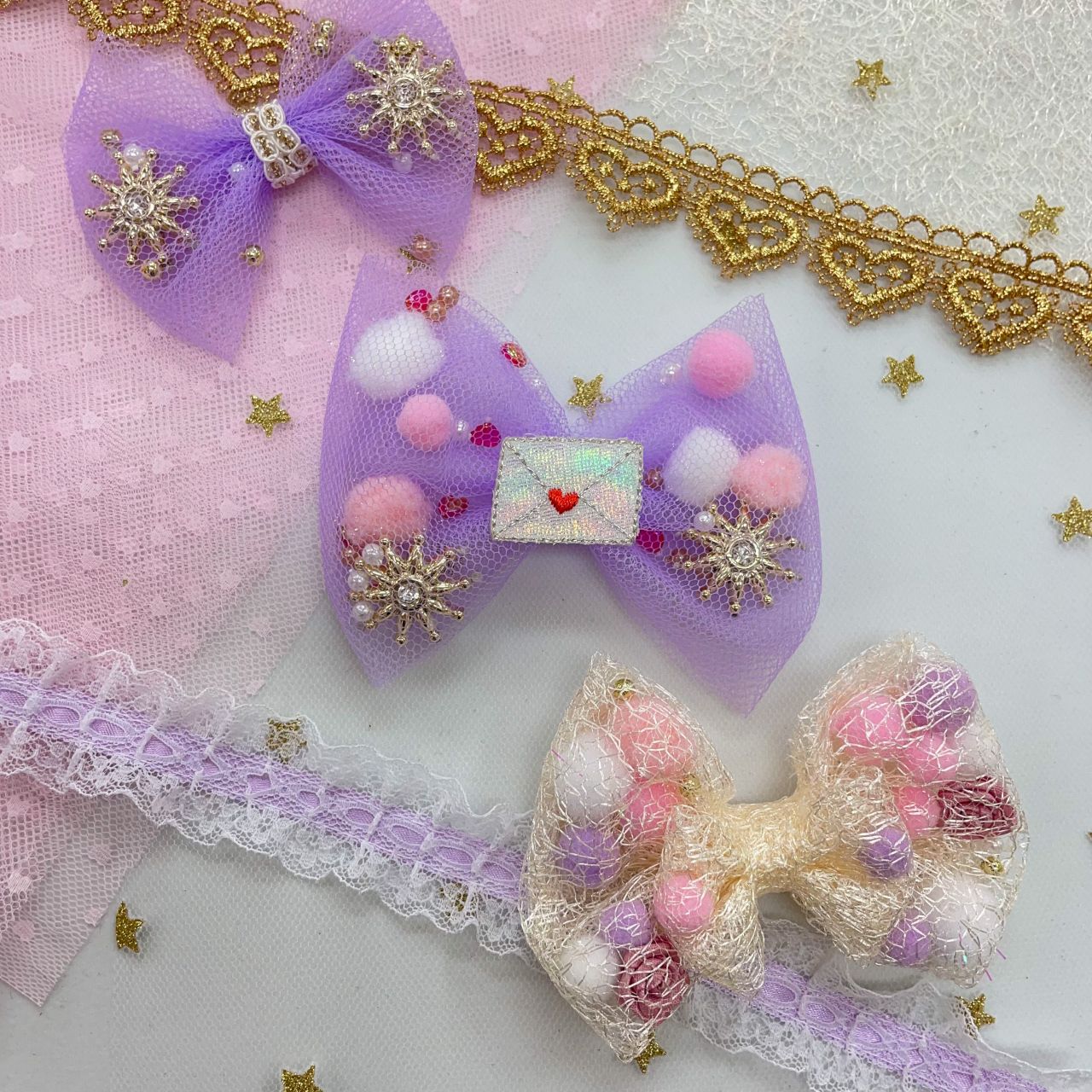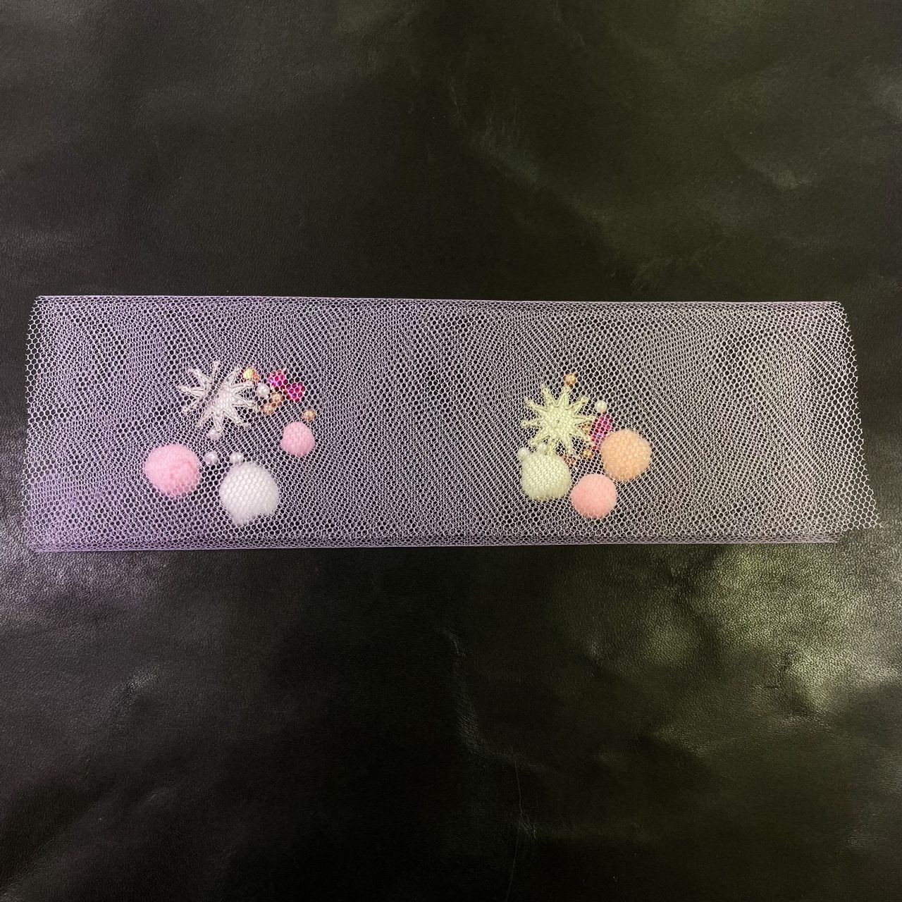 (この時、裏表のあるパーツなどを入れる時はチュール側に見せたい部分を向けて配置するとリボンを作った時、綺麗に見えます!)