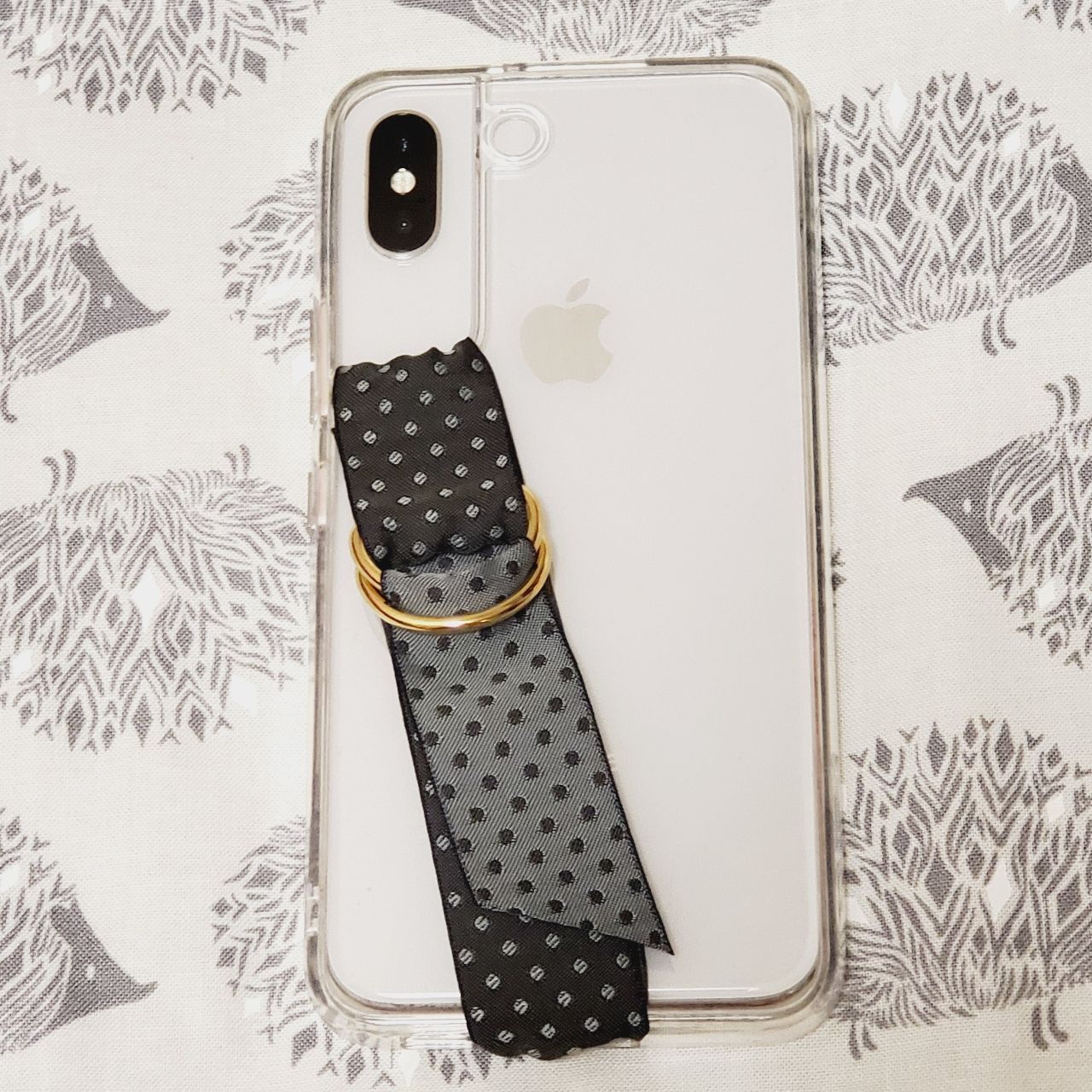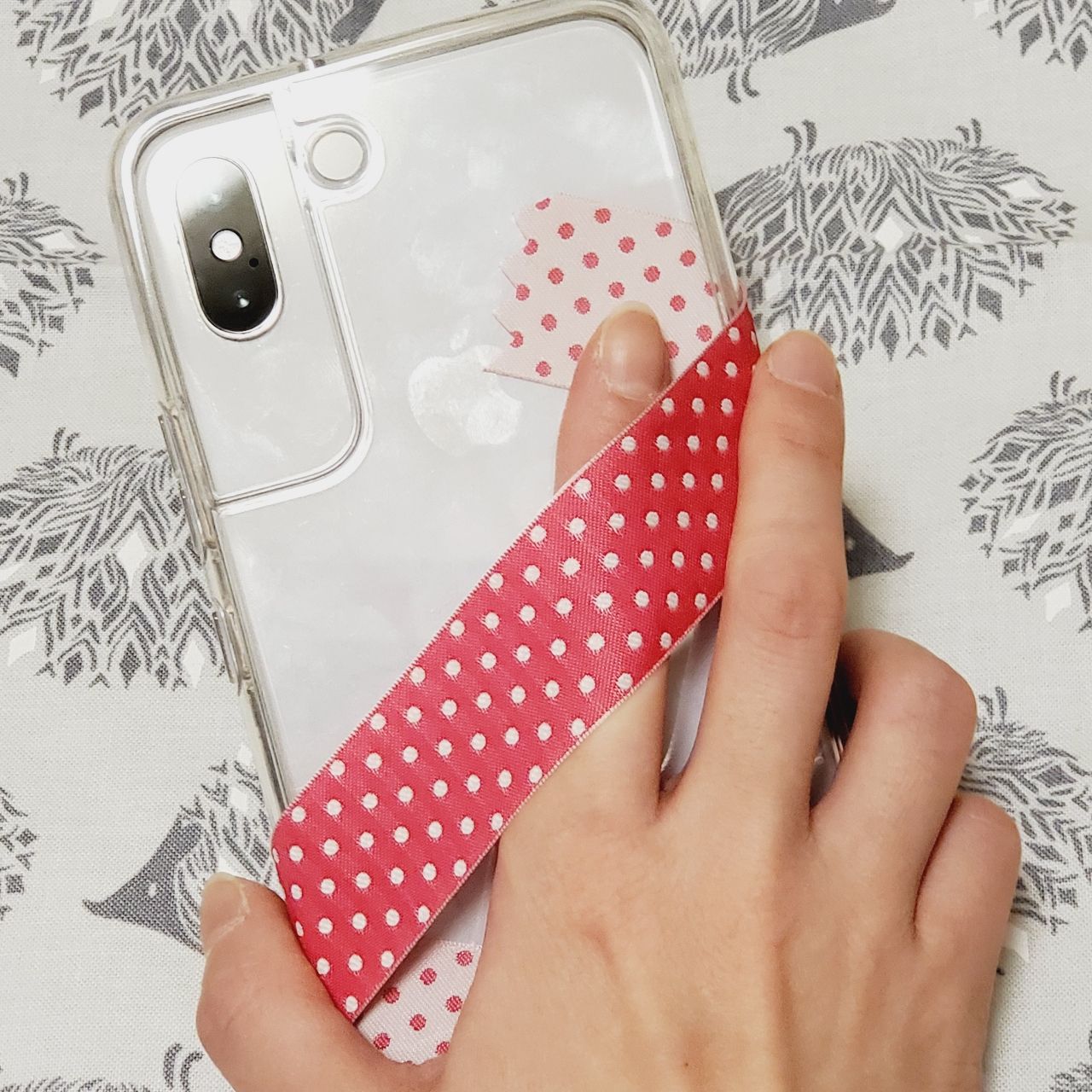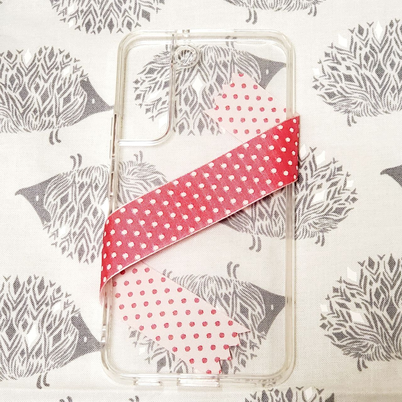 カメラやボタンの位置と相談しつつ、スマホカバーにリボンを巻き付けます。