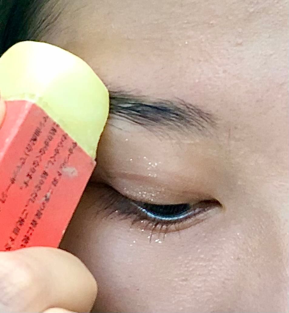 指でよく揉み柔らかくしてから親指の腹で眉頭から眉尻へ塗り伸ばします。