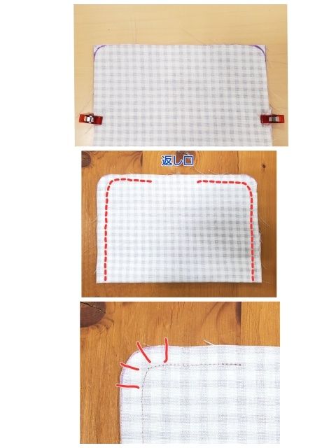 角を丸くカットし、端から1cmで縫う。