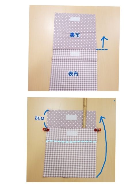 ステッチした所を、上から8cmで谷折りにし、