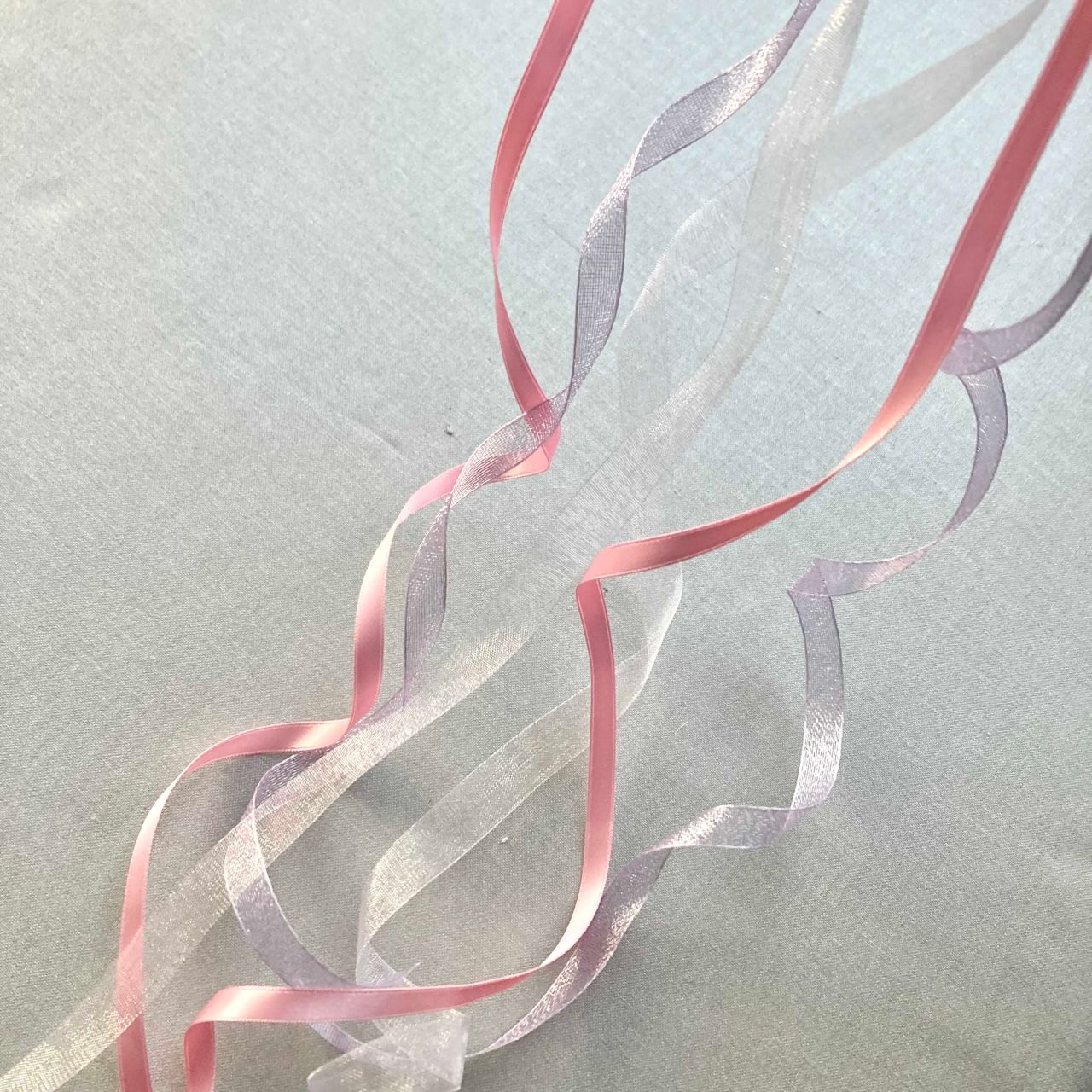 細幅のサテンリボンとオーガンジーリボン、ファインクリスタルリボンの3種類をカールさせ、ハーフツインに合わせた可愛らしいアレンジです!