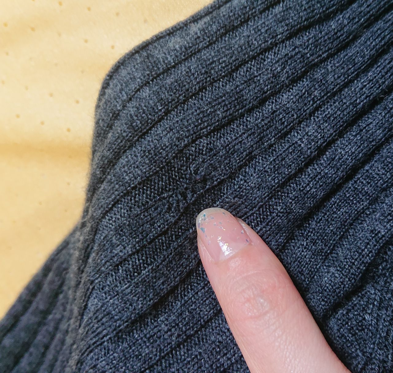 全く身に覚えがない穴ですが、どうやら「尖ったものにひっかかって切れてしまった系」の穴です。