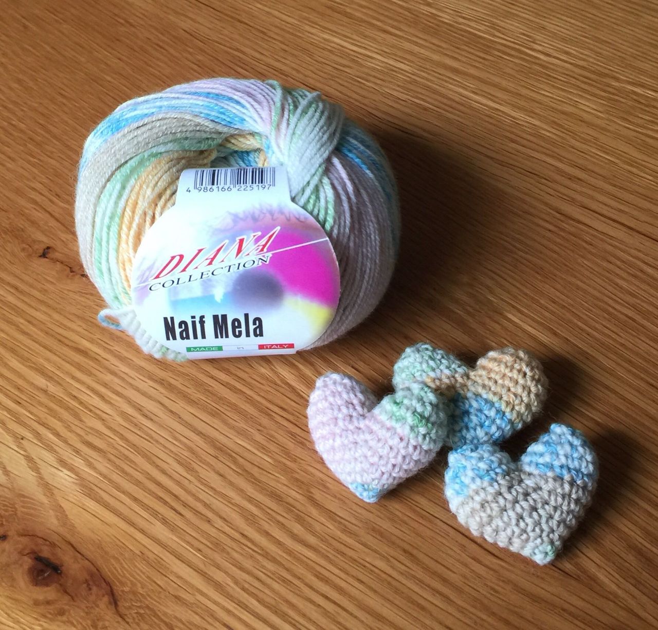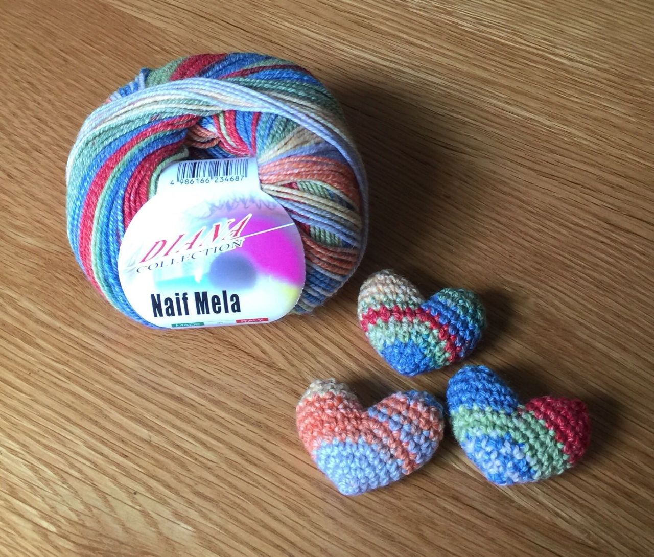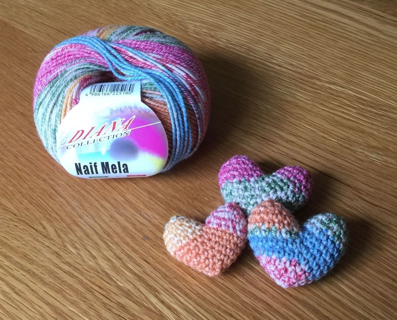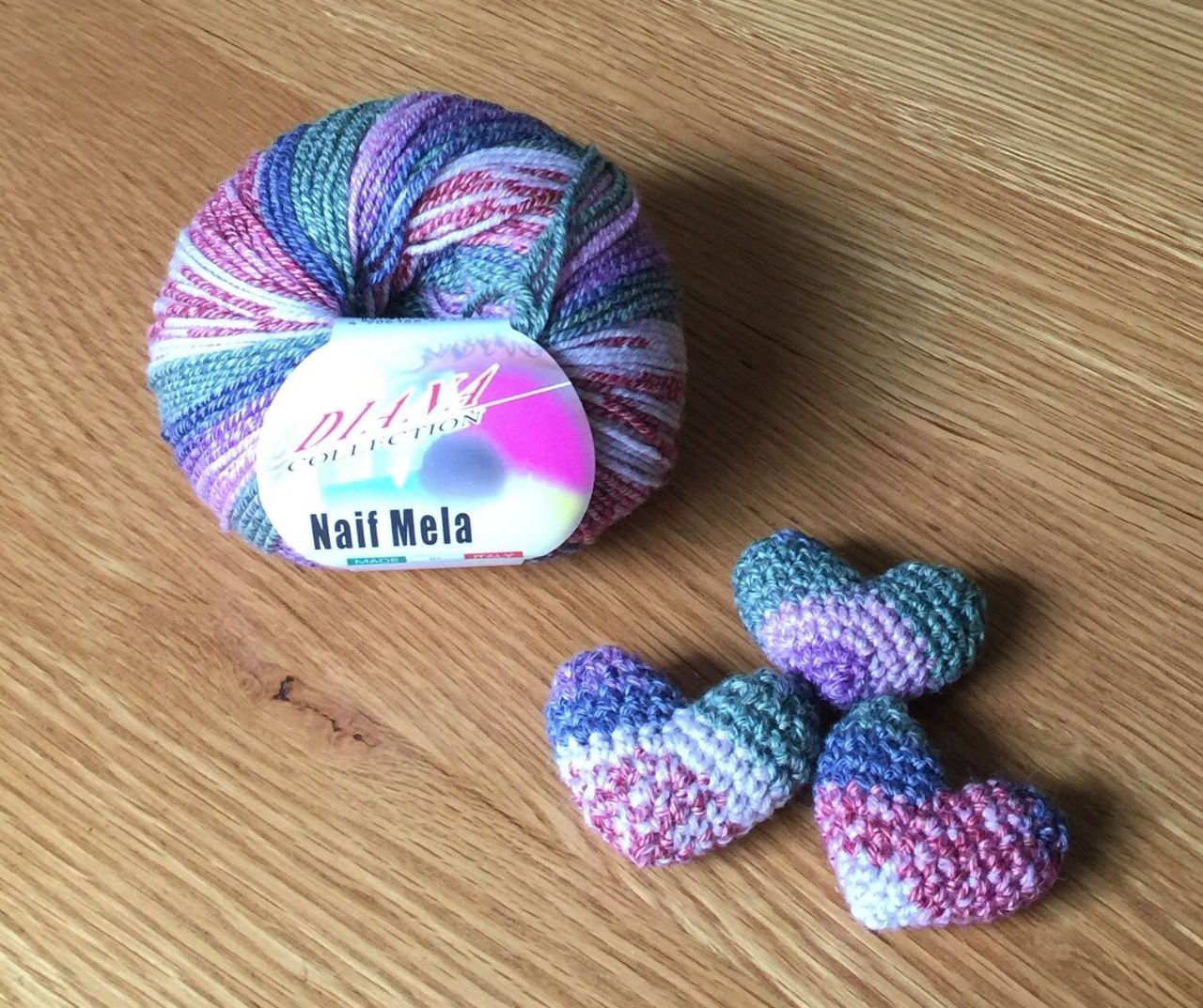 この糸は1つの玉でも色々な柄のハートが編めるんです。