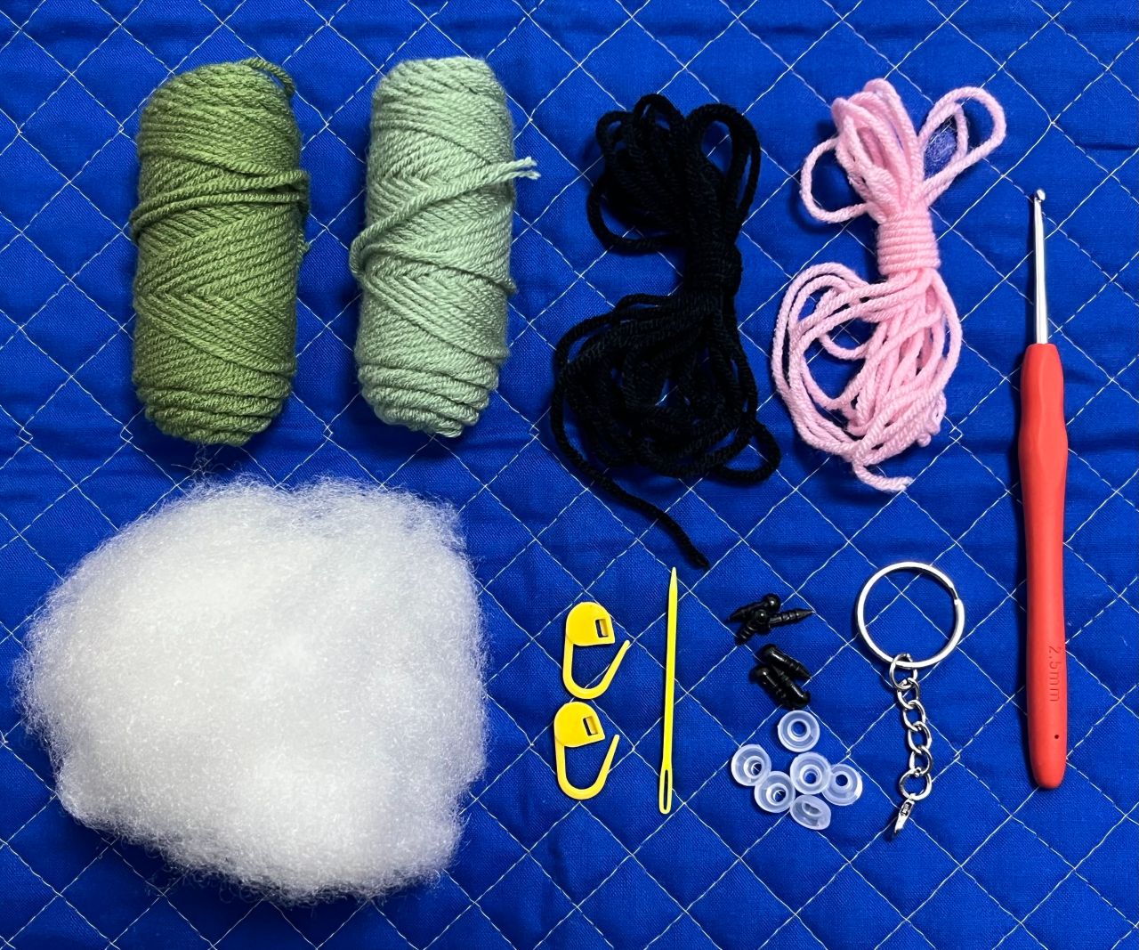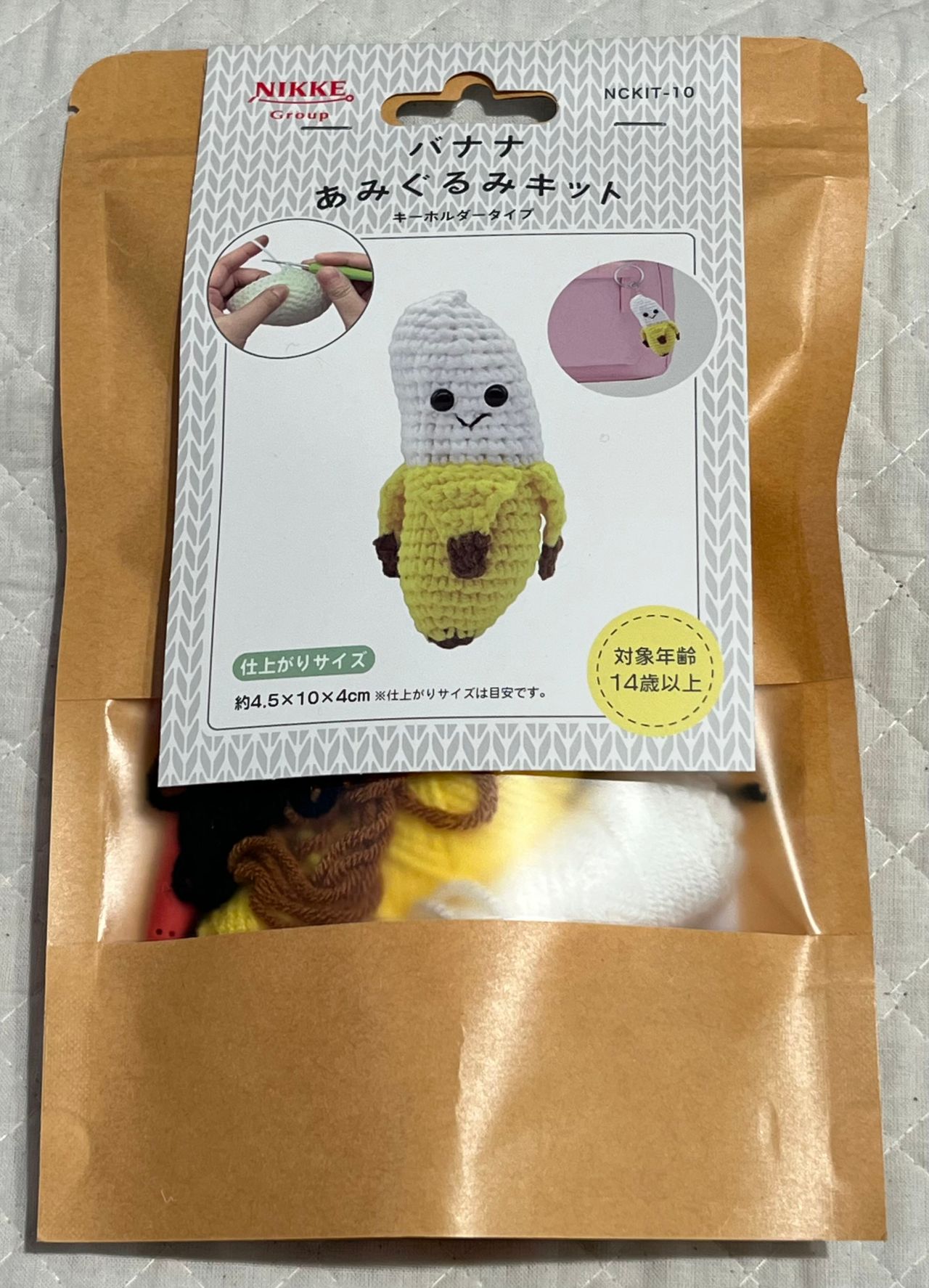 キットをあけると、糸と編み図、編み針、とじ針、マーカーなどの道具はもちろん、わたまで入っていてこれ一つで出来ちゃう手軽なキットになってます