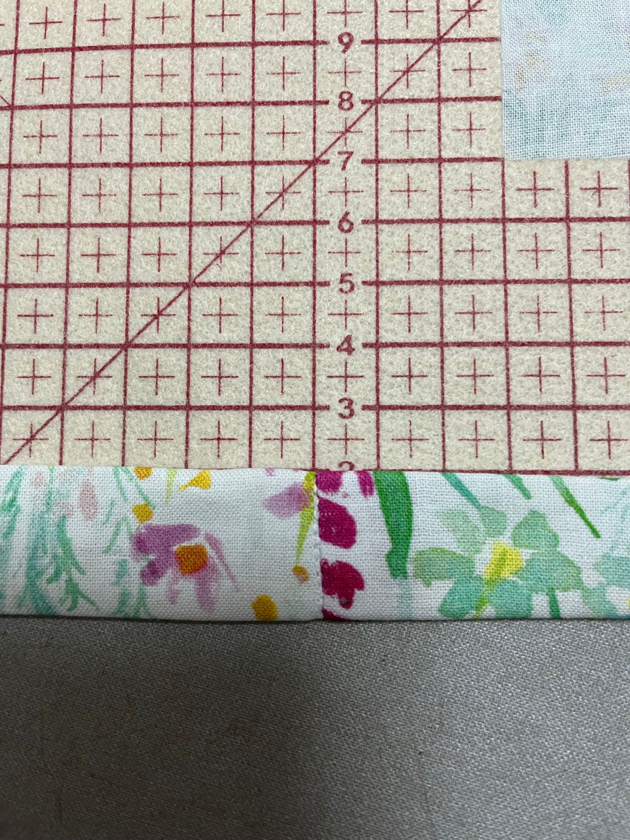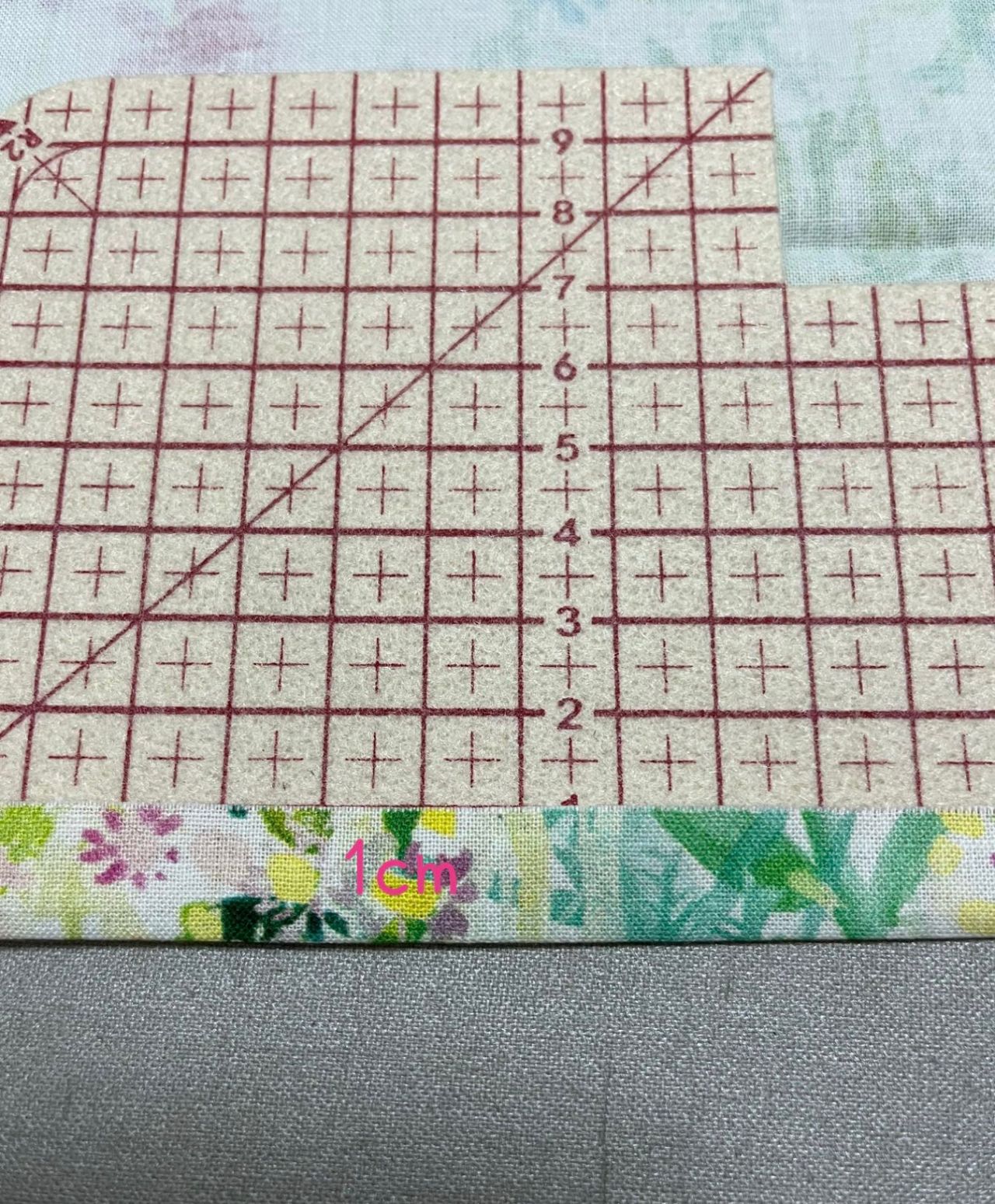 下から1cm折りアイロン→さらに2cm折る三つ折りをし、アイロンをかけます。