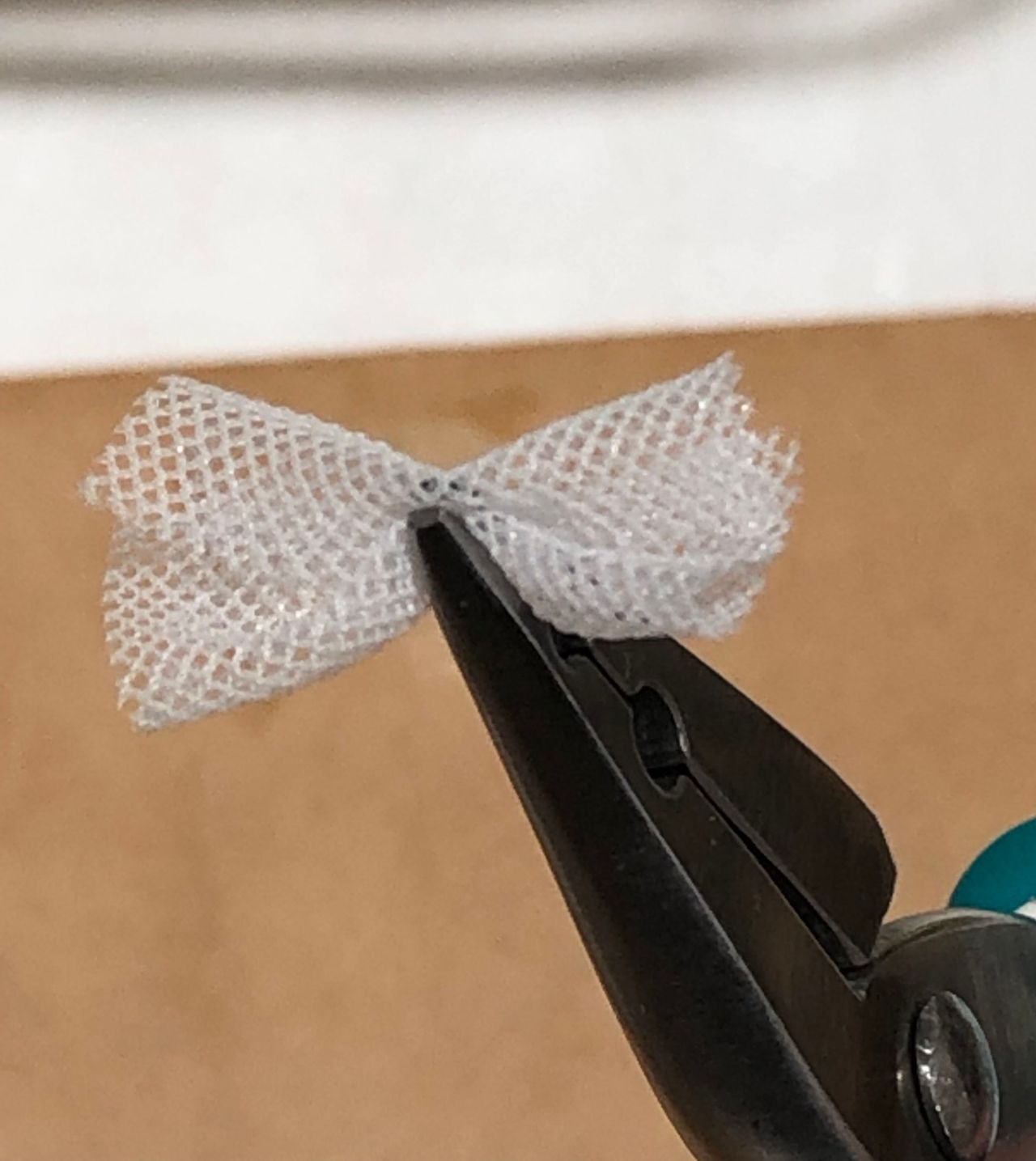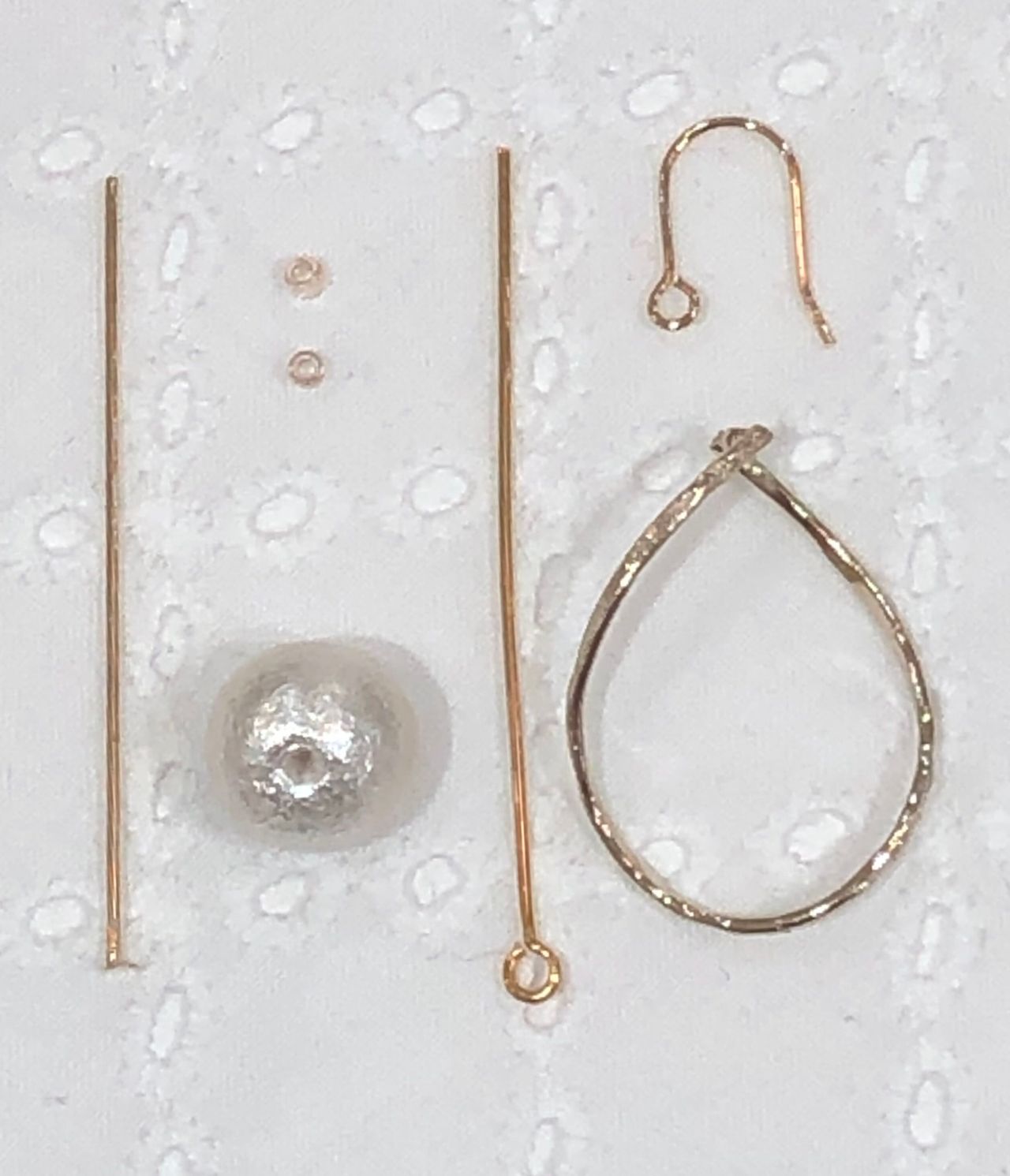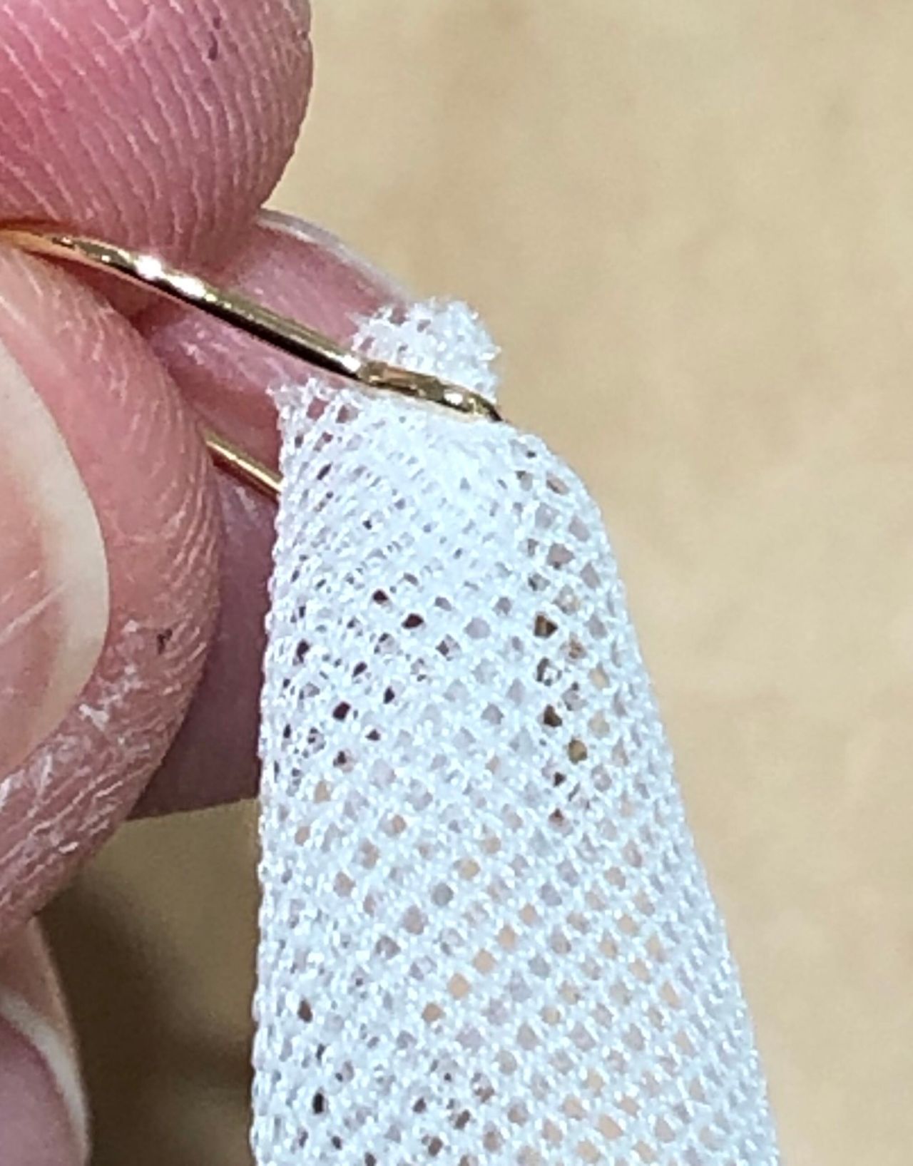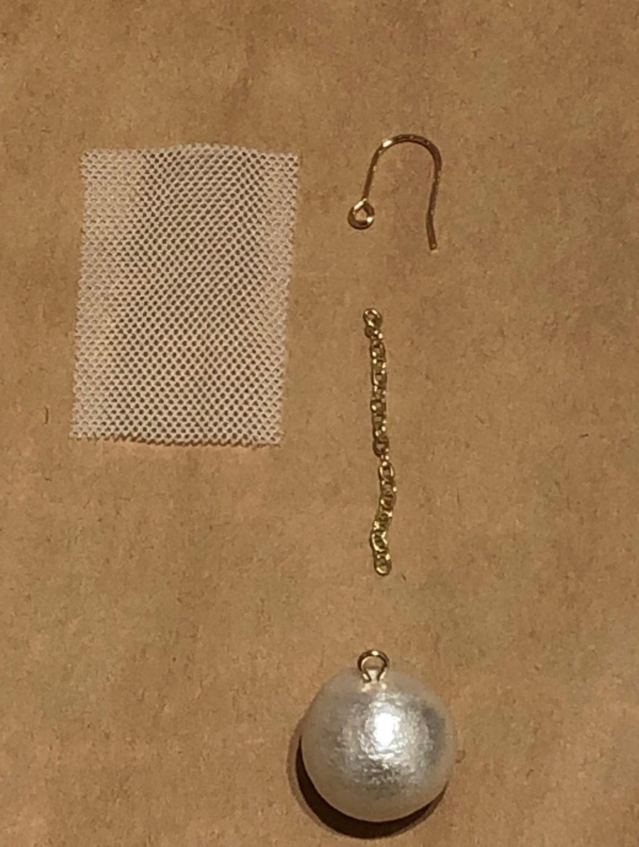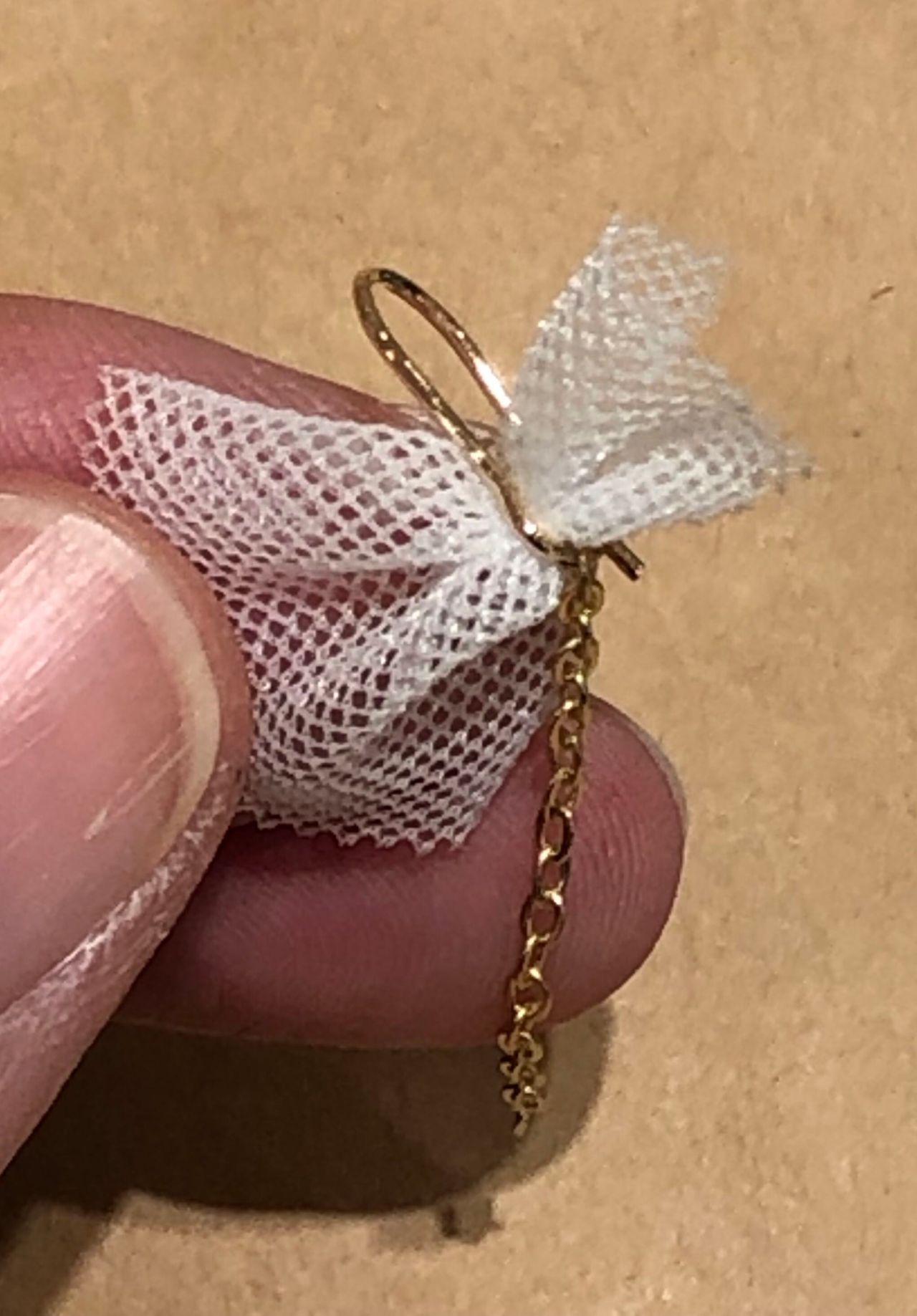 ピアスのカンを戻して、チュールリボンをカンに通します