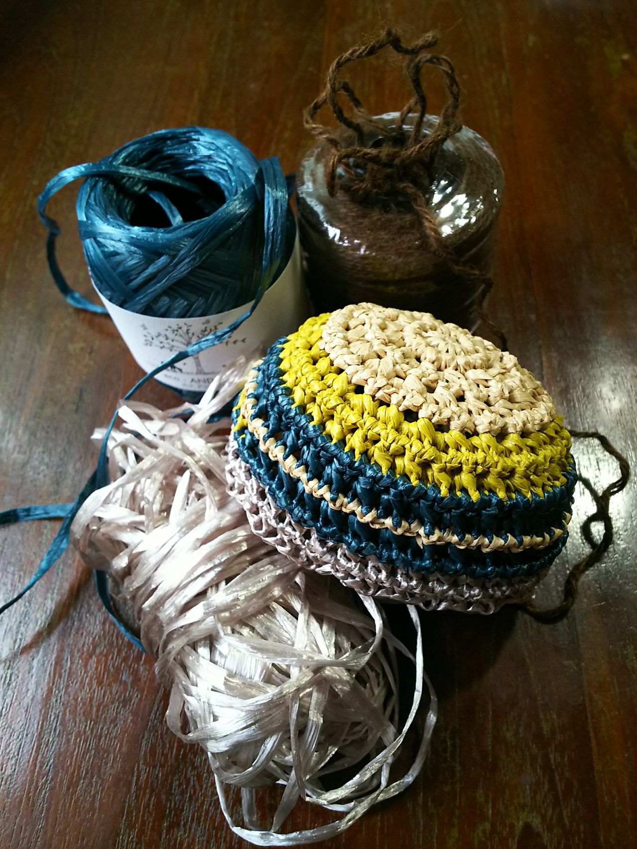 今回はエコアンダリヤや麻ひもの余り糸ちょっとずつをまとめてやっつけちゃいます(笑)