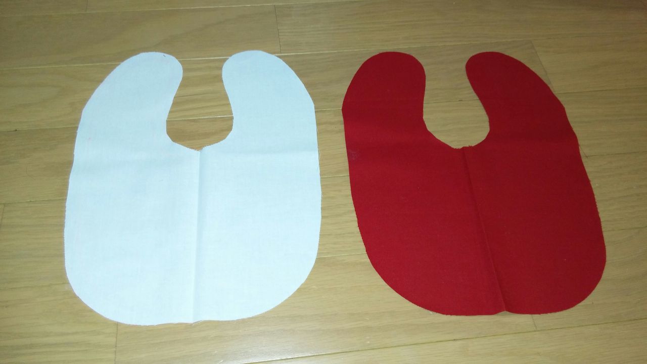 赤と白の生地を中表に合わせて縫い