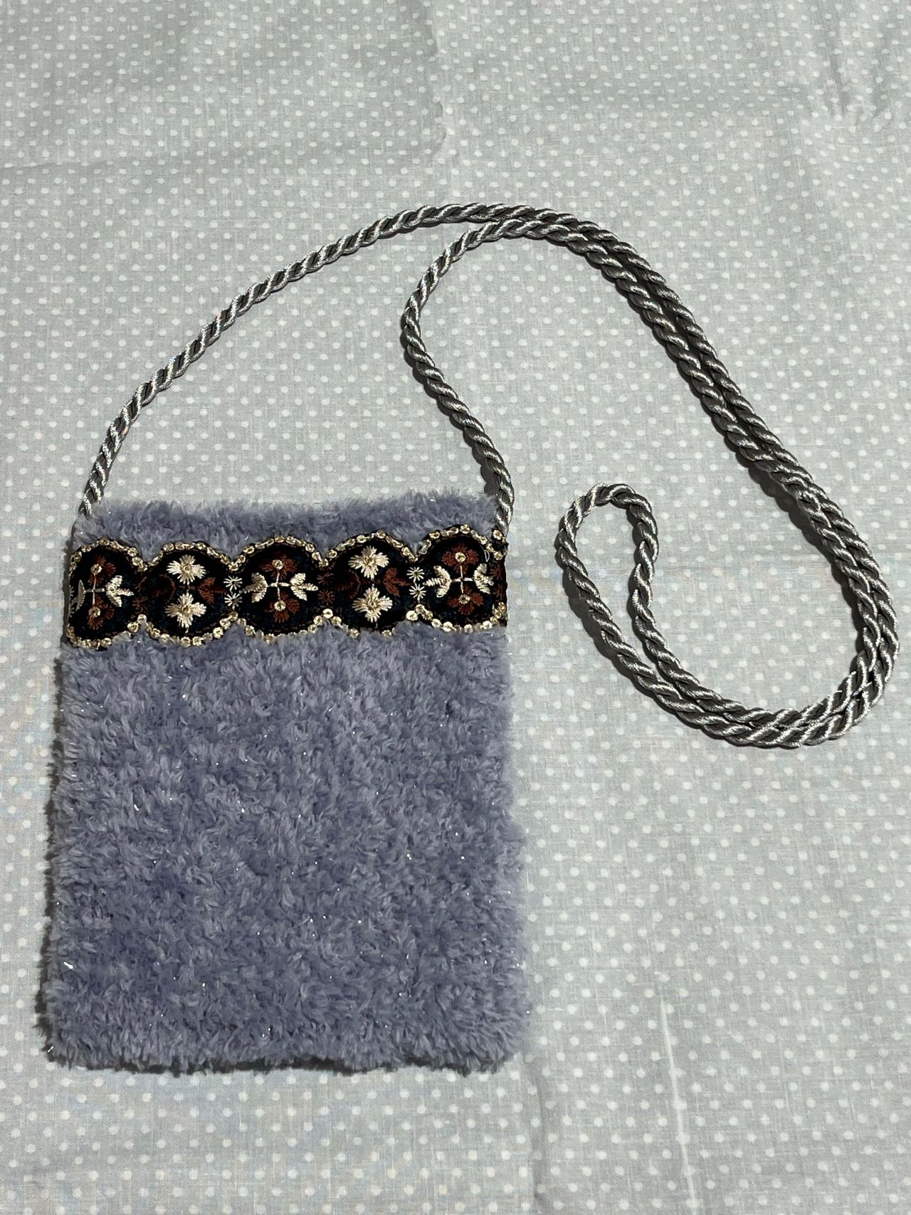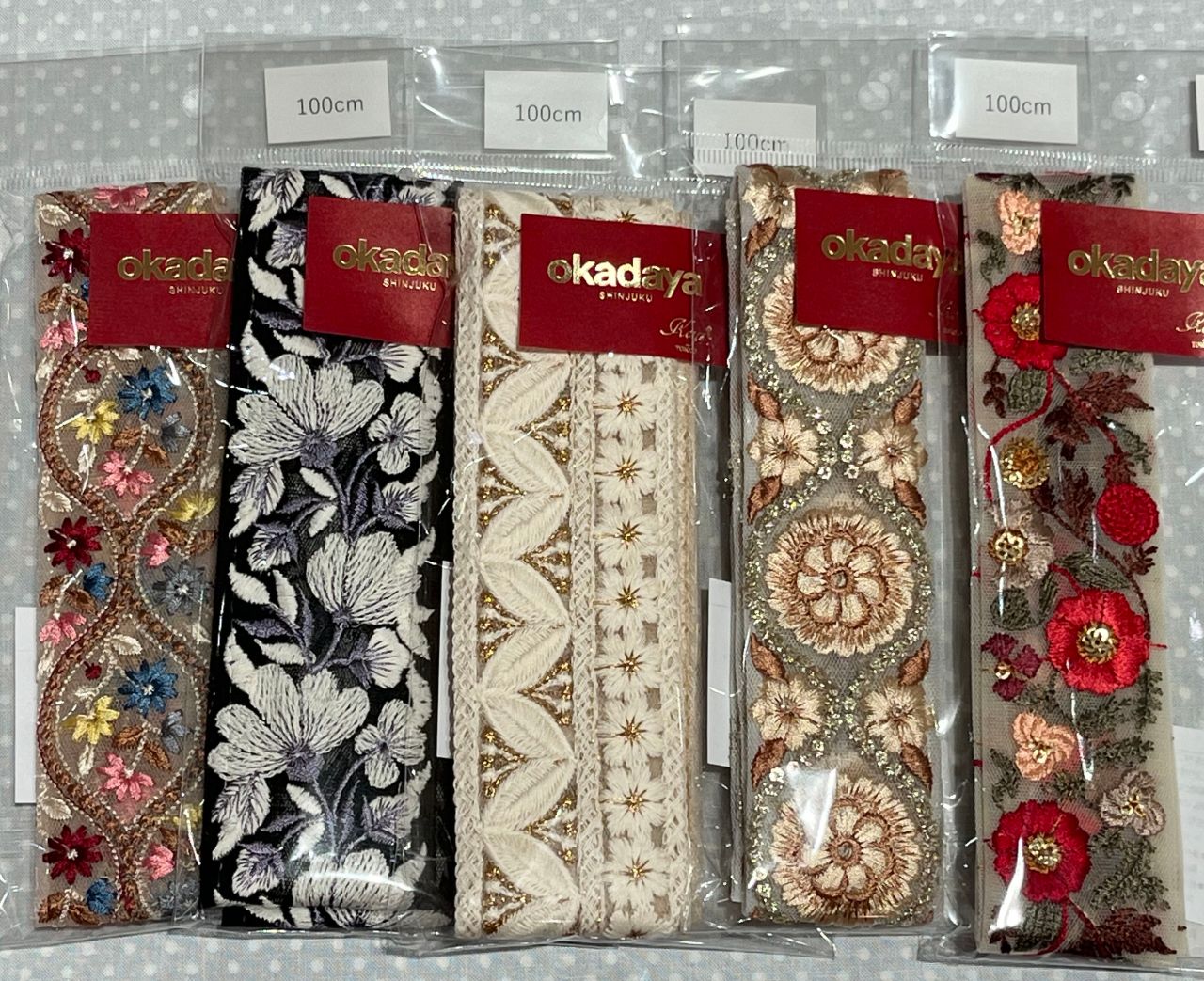 インド刺繍リボンの両端にひもをつけ、縫い付けました。