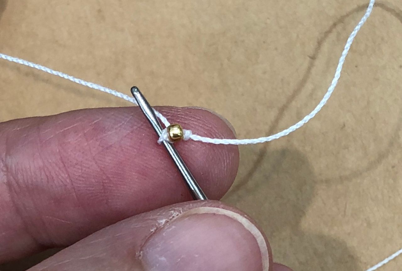 作り目6目。ビーズをひと粒づつ編み込んでいきます。