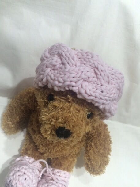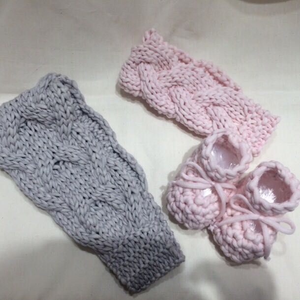 ヘアバンドは棒針ベビーシューズはかぎ針で編みました。