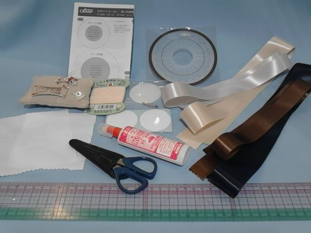 必要なリボンを揃え、パーツを合わせてボンドで貼付けます