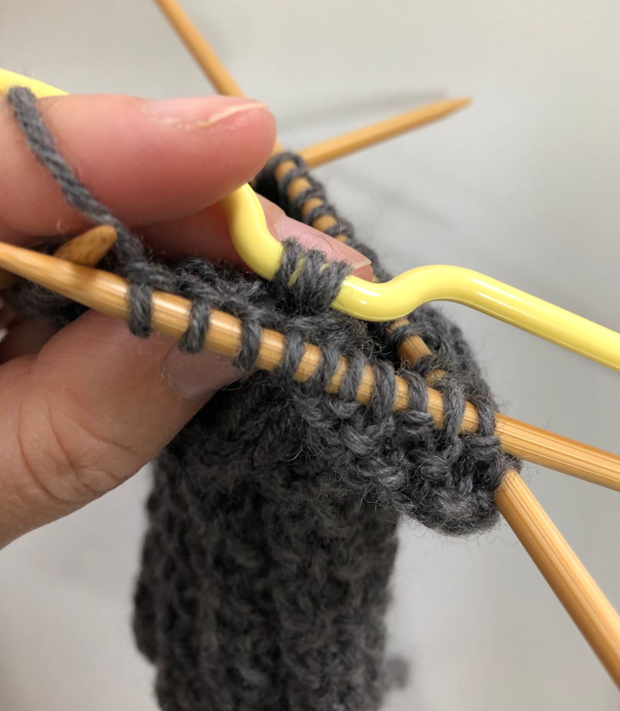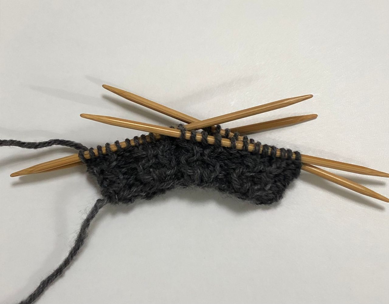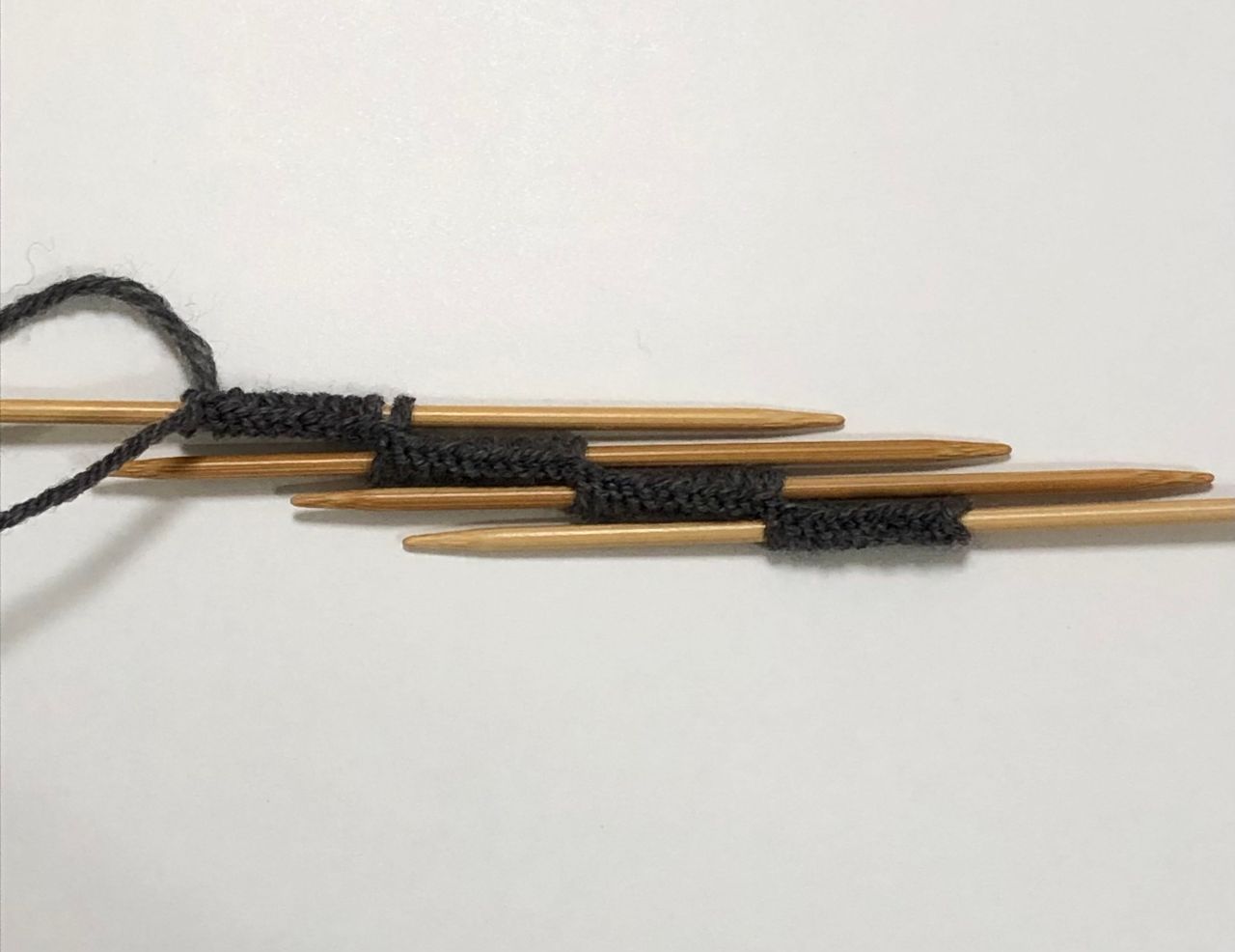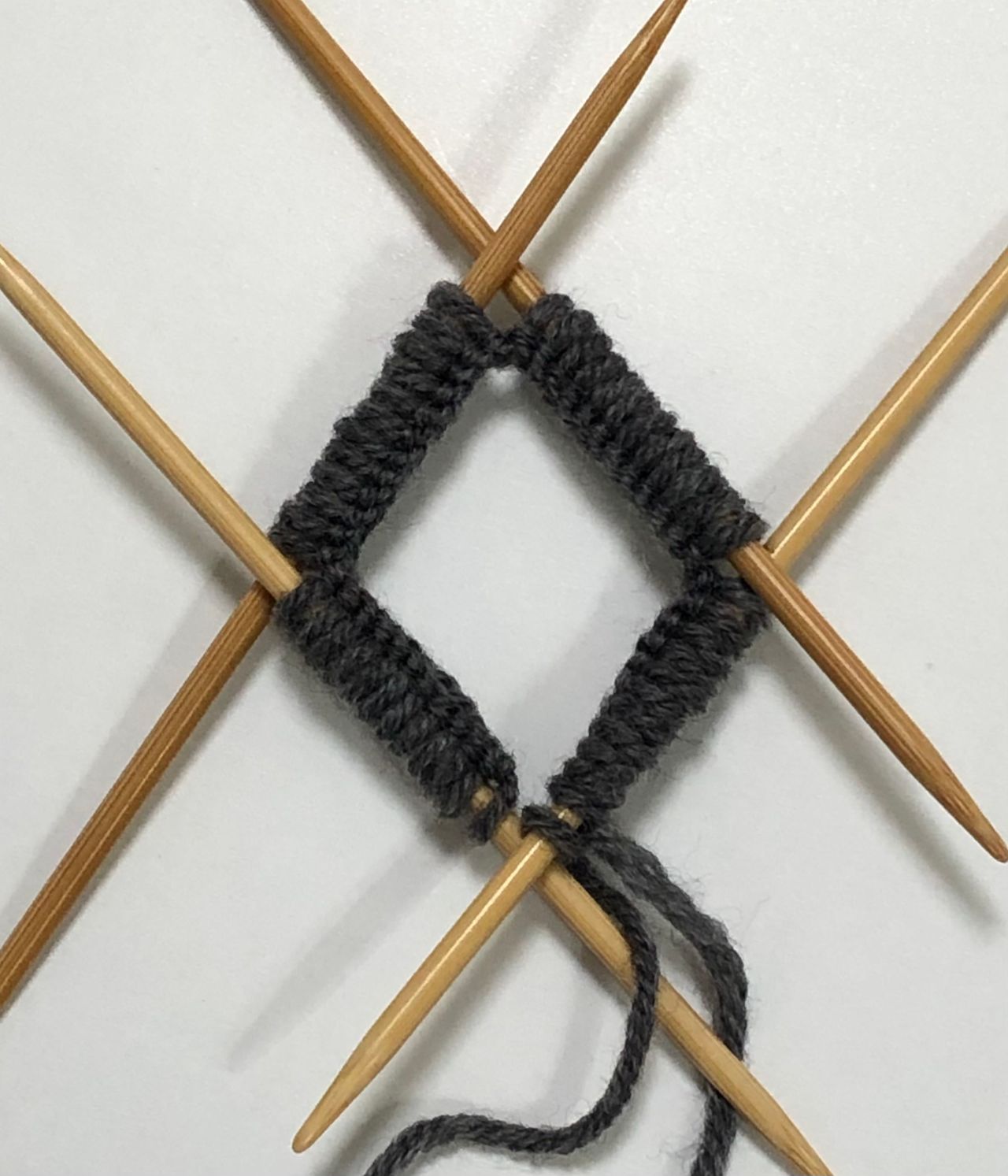 輪で編み進めるので、四角形にします。(4本針の時は三角形)