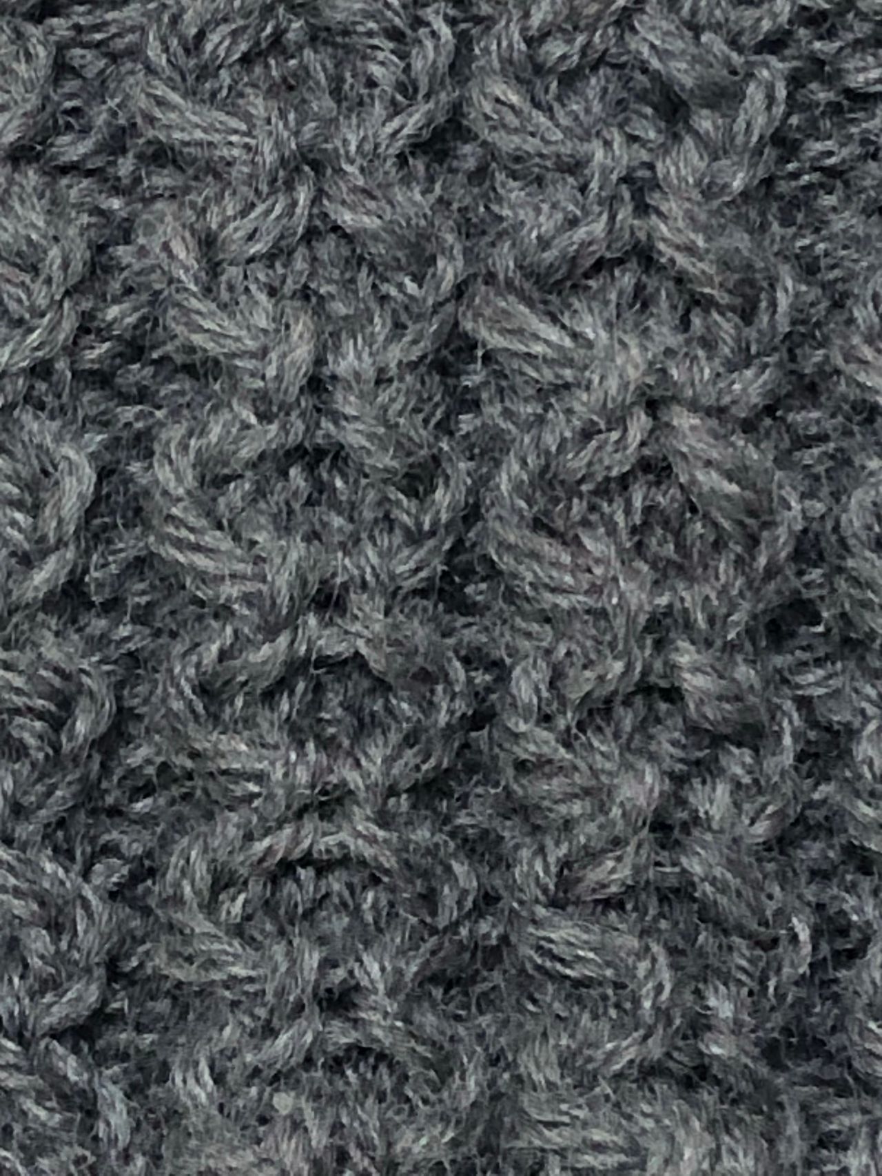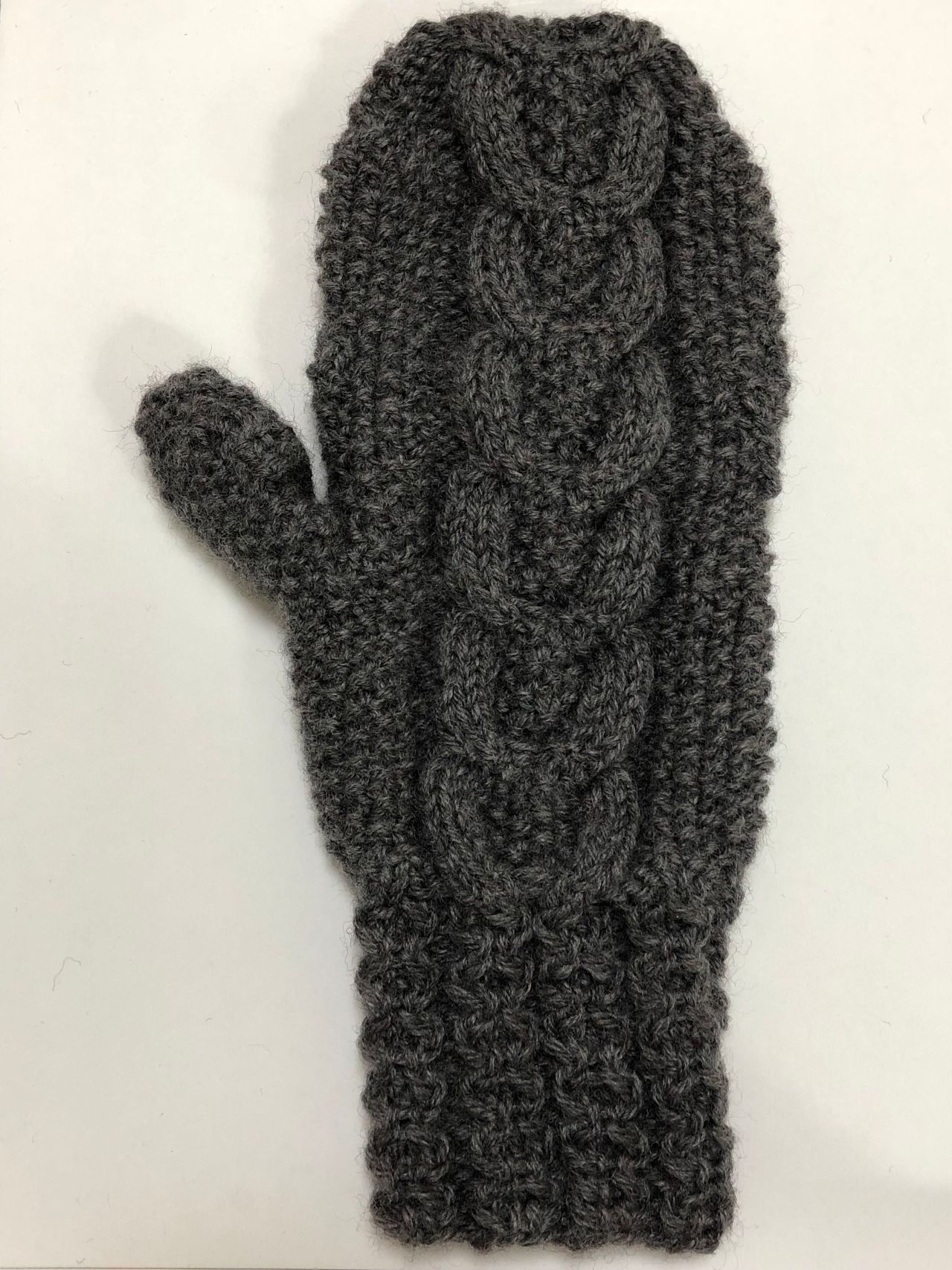 手の甲側は10段ごと3目交差の縄編み、手のひら側はかのこ編み