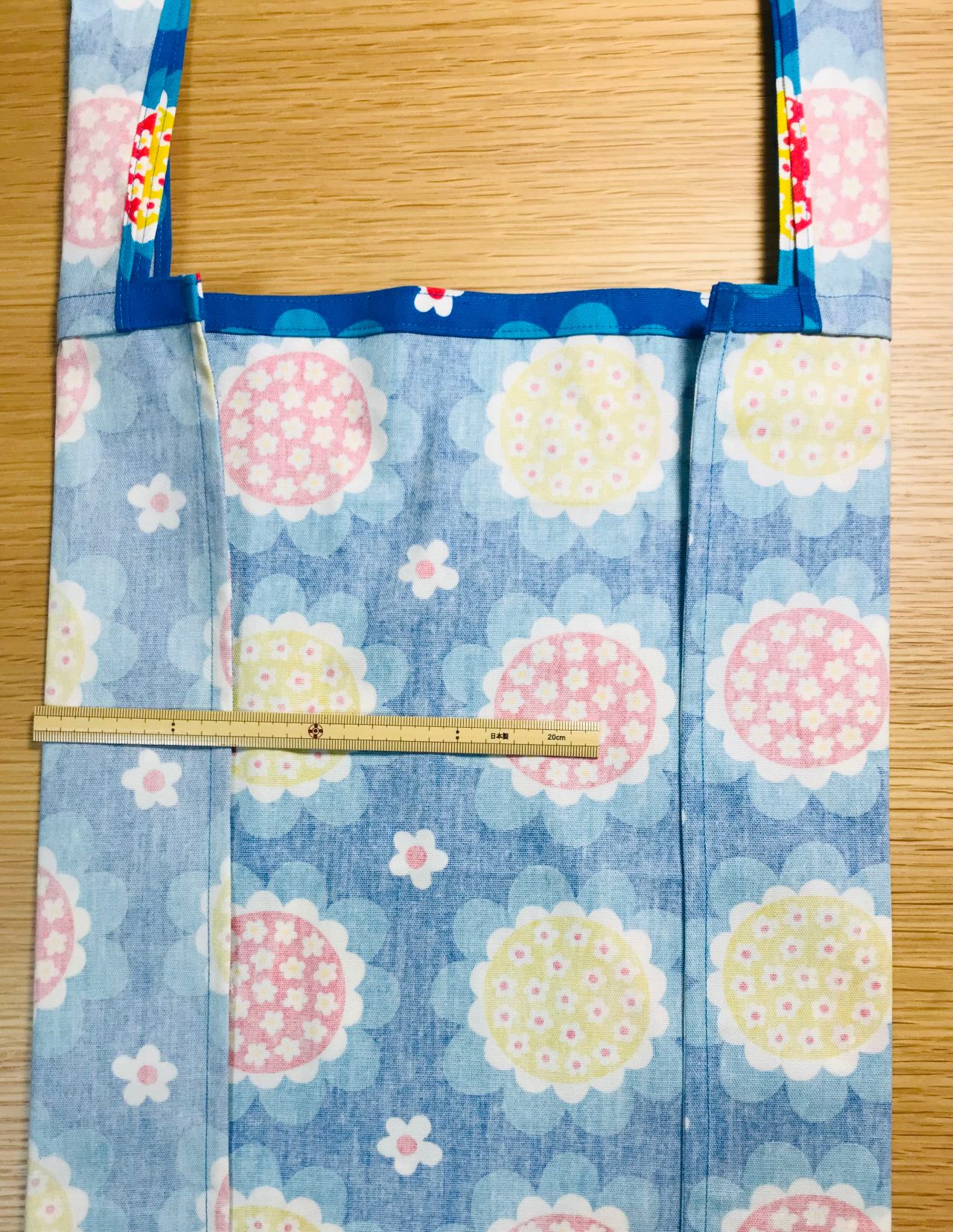 両端から7.5cmの位置に持ち手の中心がくるように挟み込み縫います。