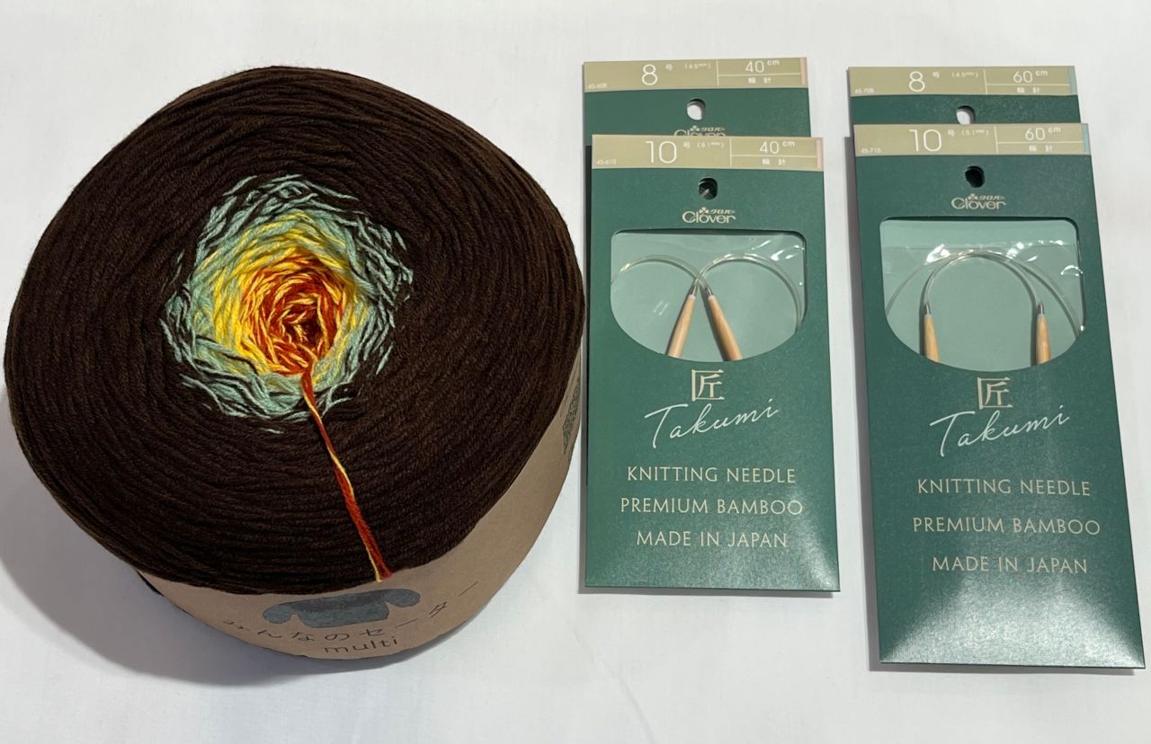 棒針10号と8号、それぞれ40㎝と60㎝輪針があると便利です。