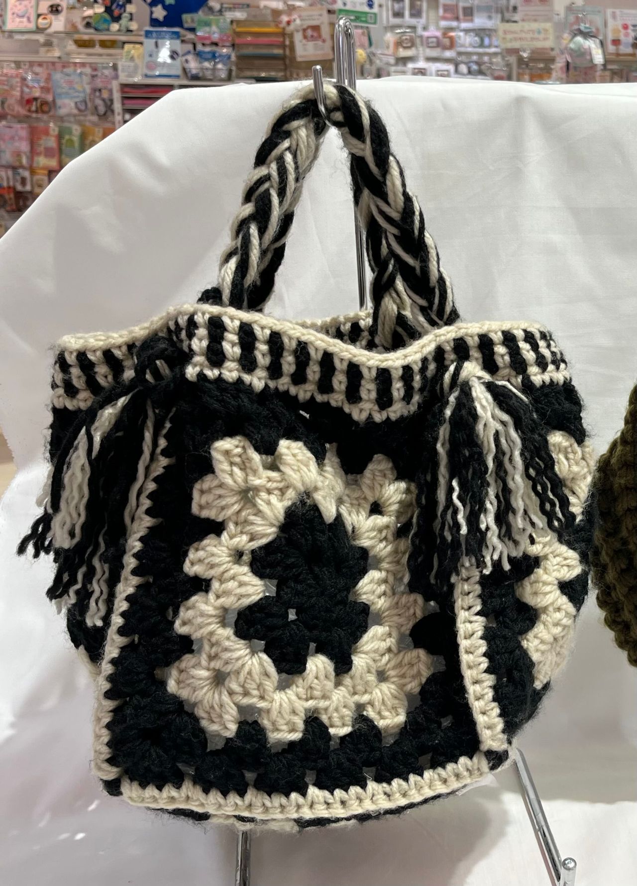 モチーフ編みのバッグ、4色