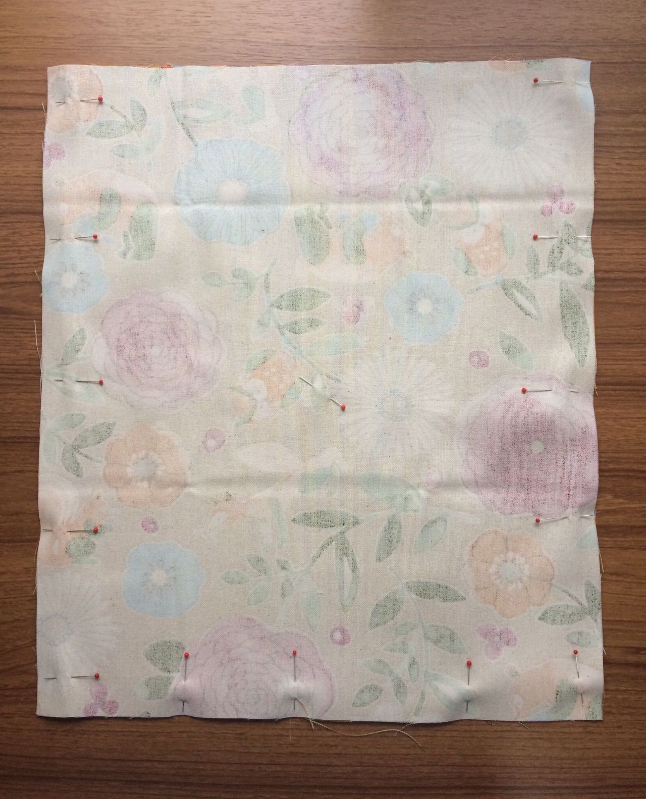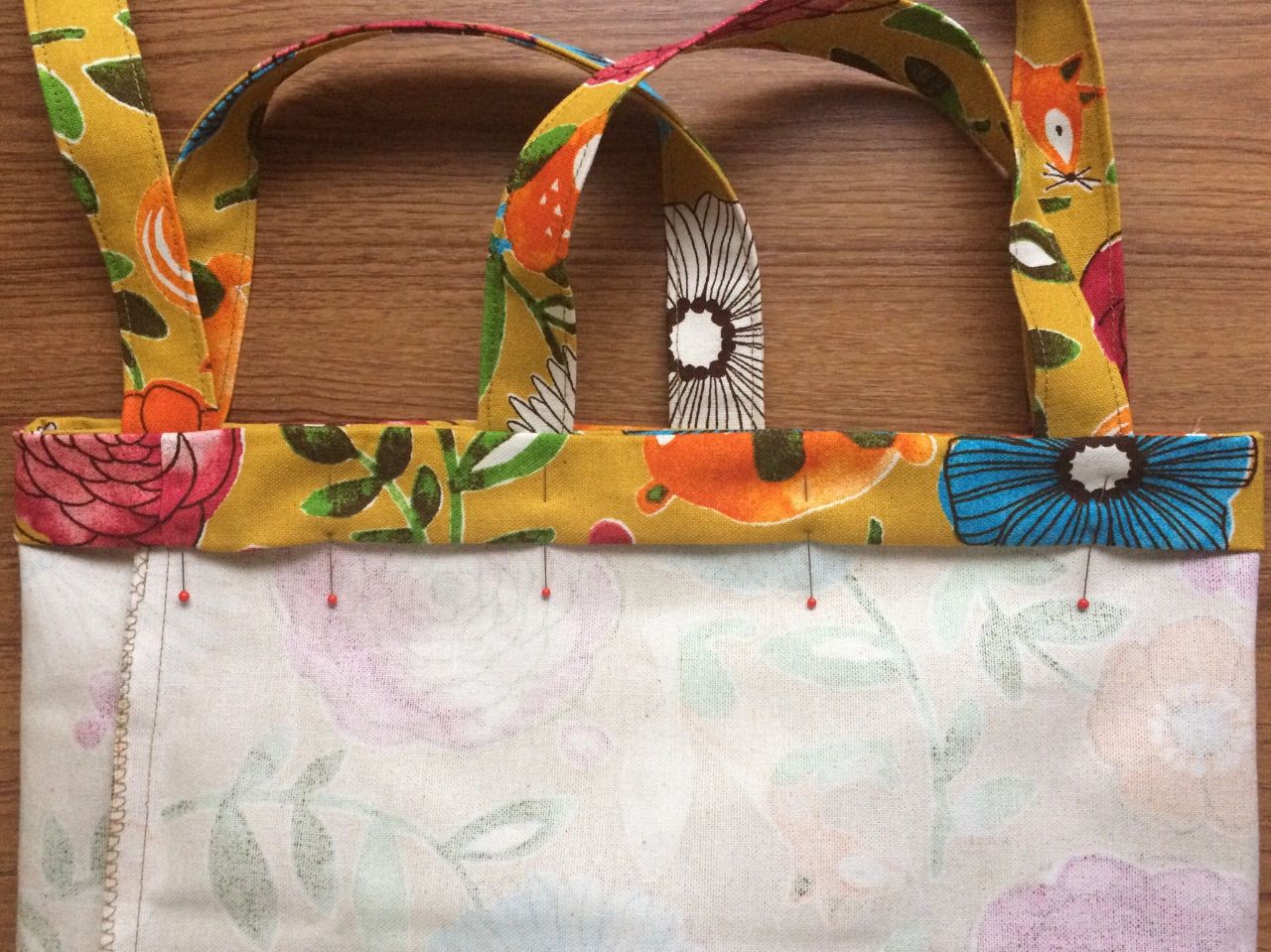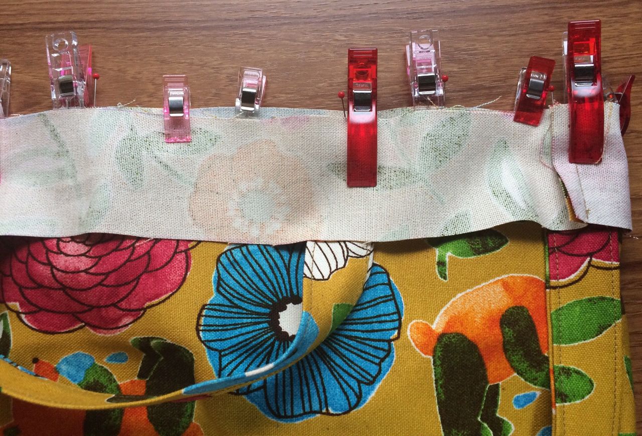 ⑤本体に持ち手と肩ひもを待ち針で止めて、見返しを重ねて縫います