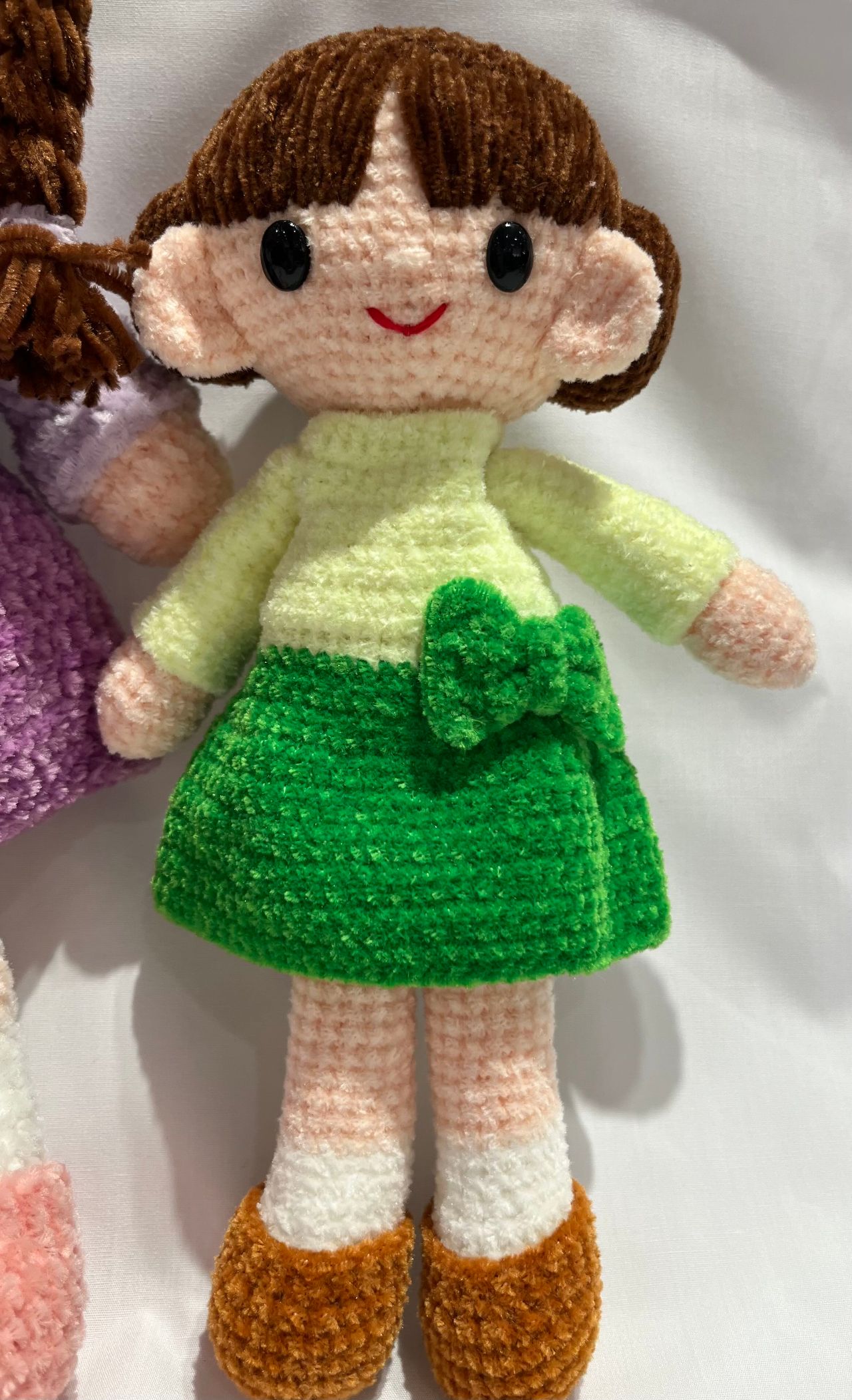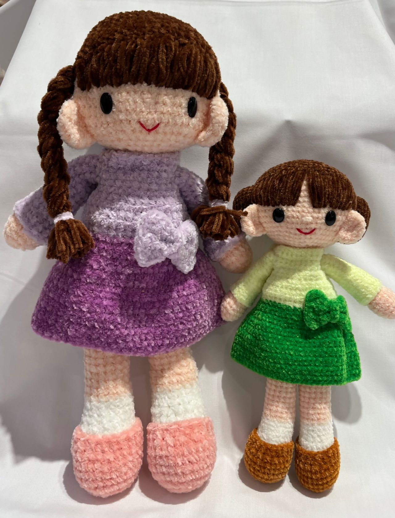 お姉さんは三つ編みおさげ、糸は並太で6号で編んでます