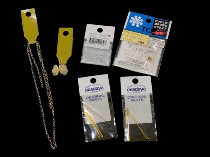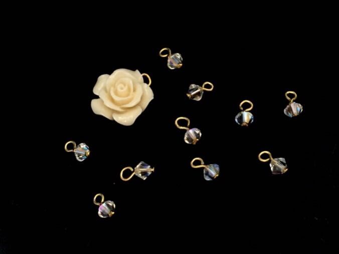 次にバラ、スワロフスキーにTピンを通して先の部分を輪にします。