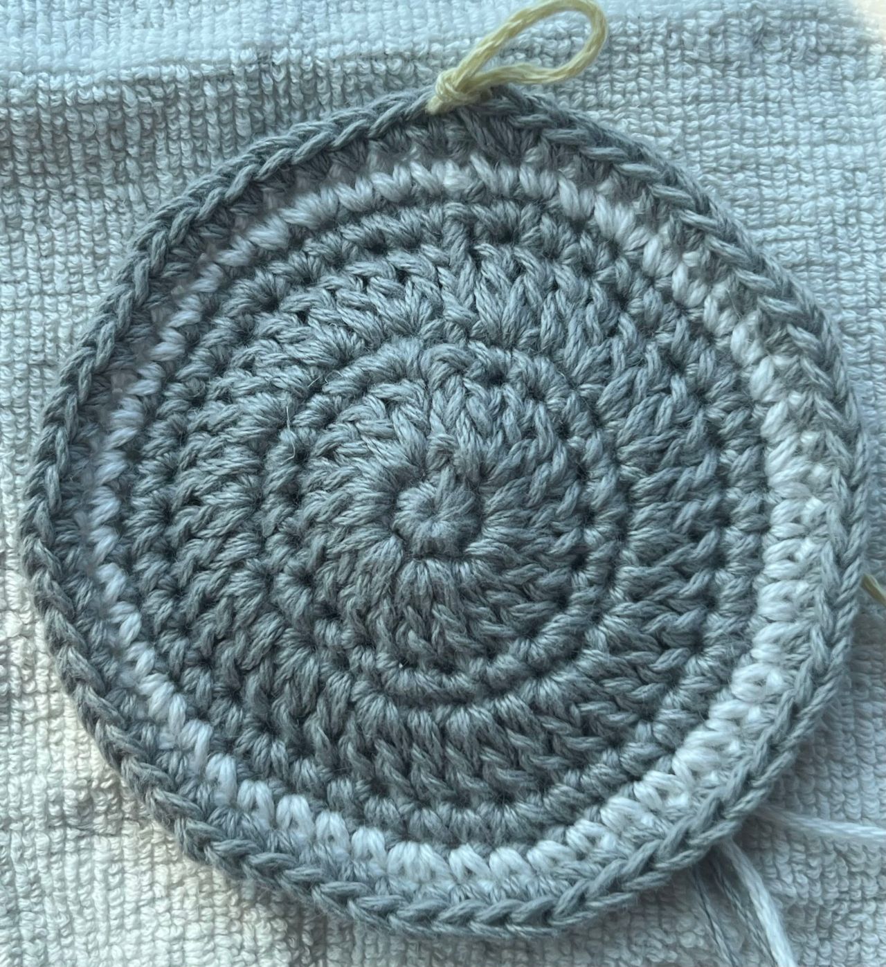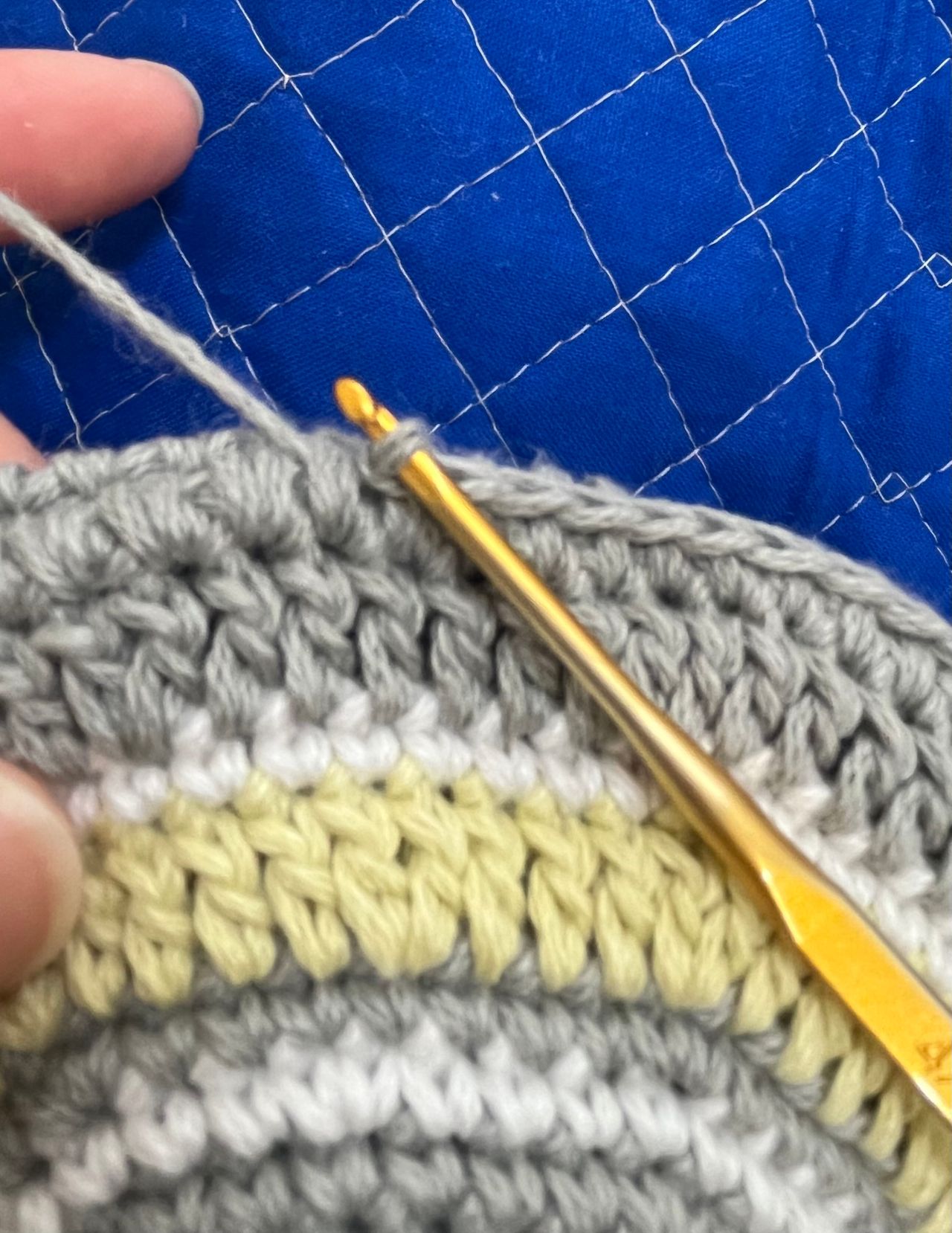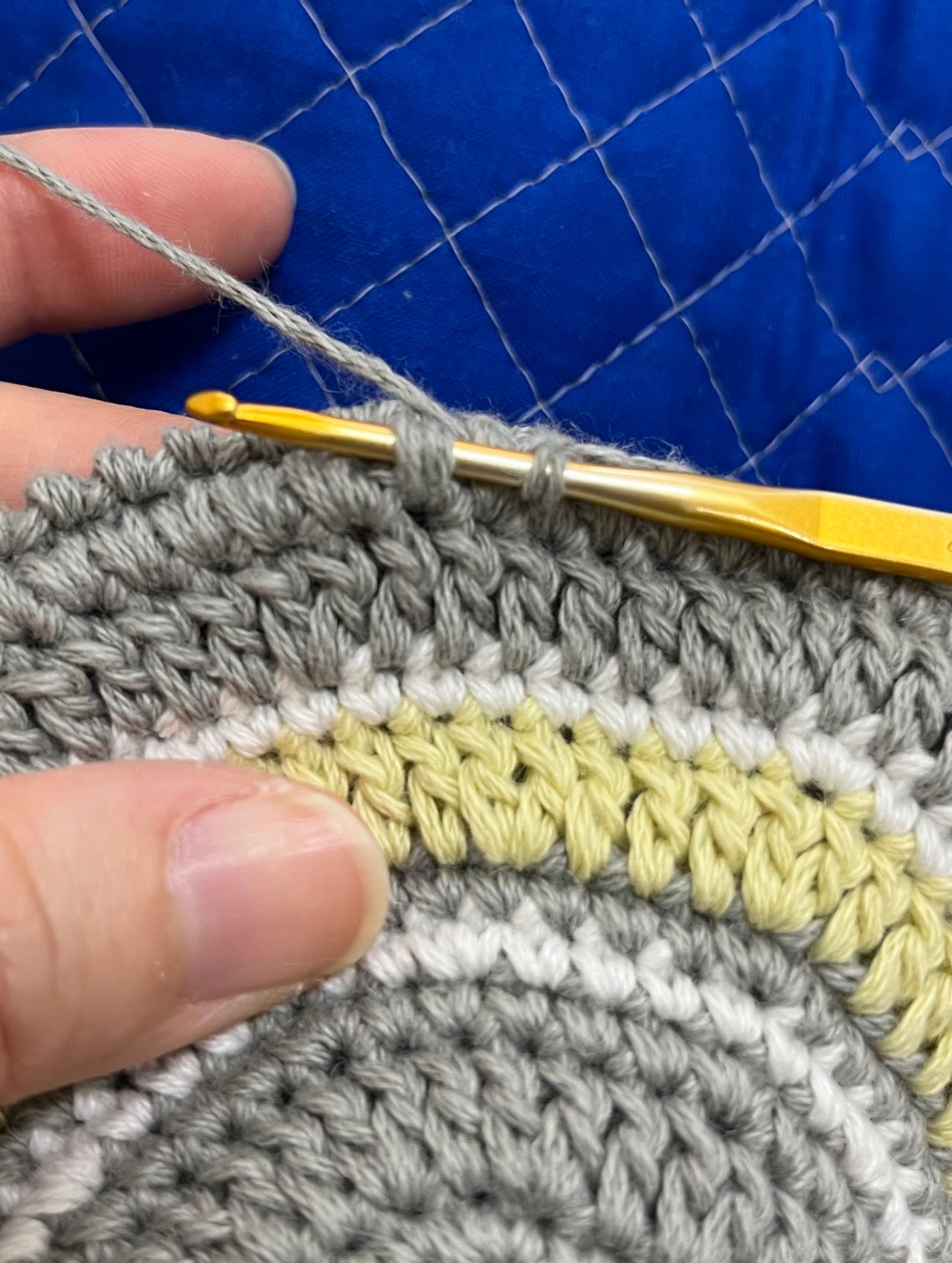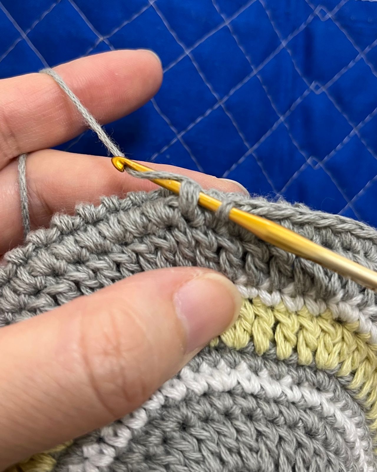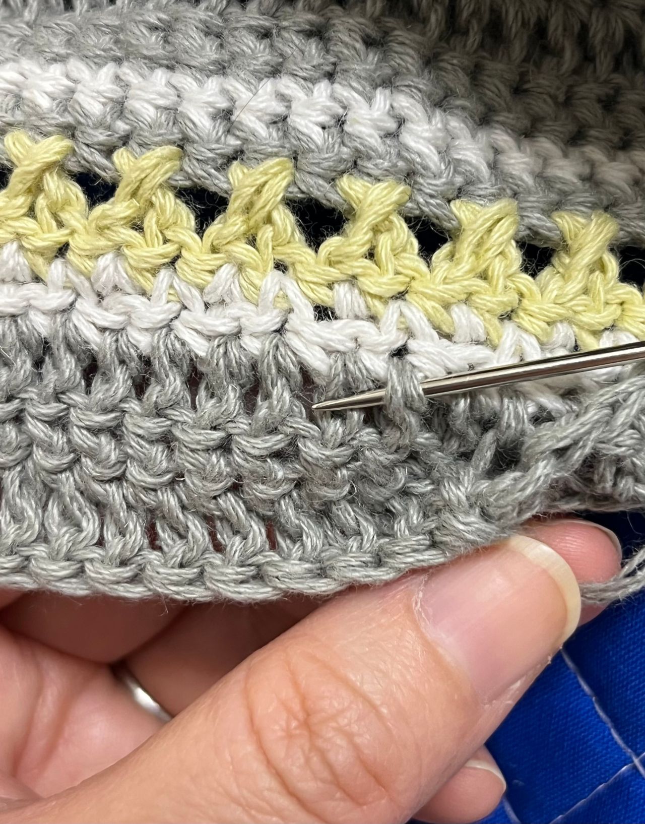 トップとクラウンの間に表側から糸をつけて1周引き抜き編みをして形を整えます