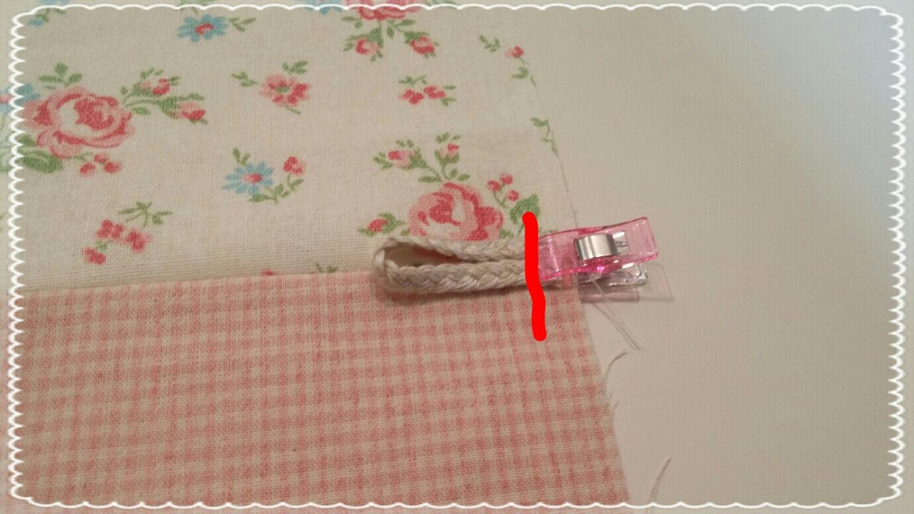 ひもは8.5㎝にカットして生地と生地の真ん中に仮止めしておきます。