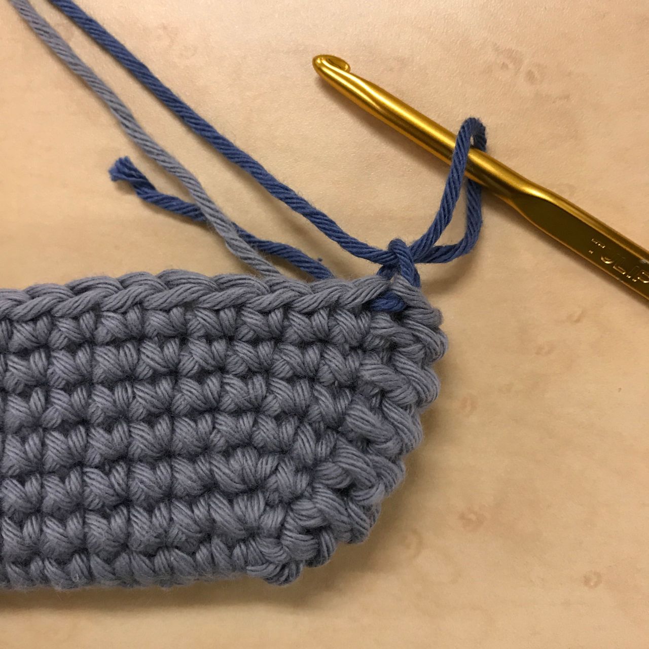 ⑤21段目まで細編み54目で立ち上げていき、22段目でバック細編みをする