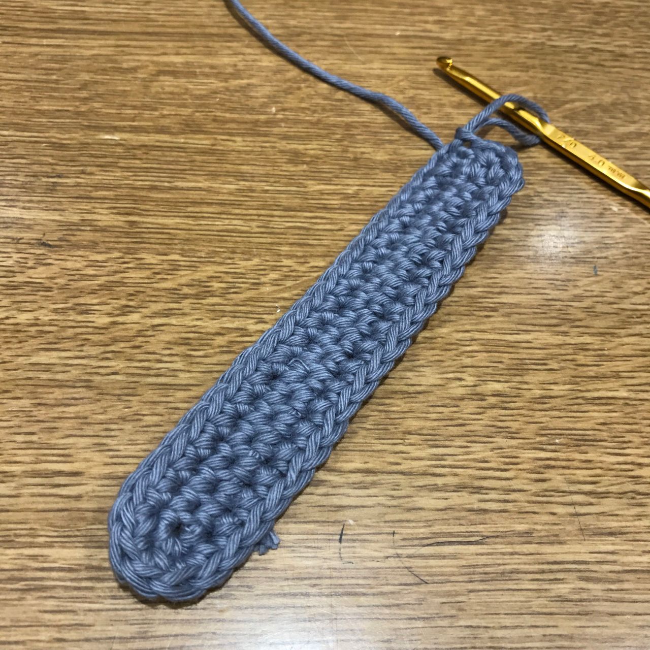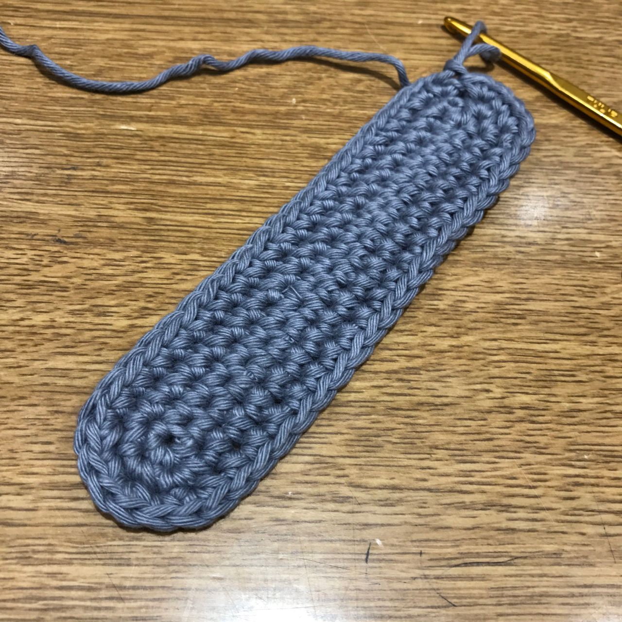 ②鎖目を割りながら細編みをし、両端で一目ずつ増やして42目の楕円を作る