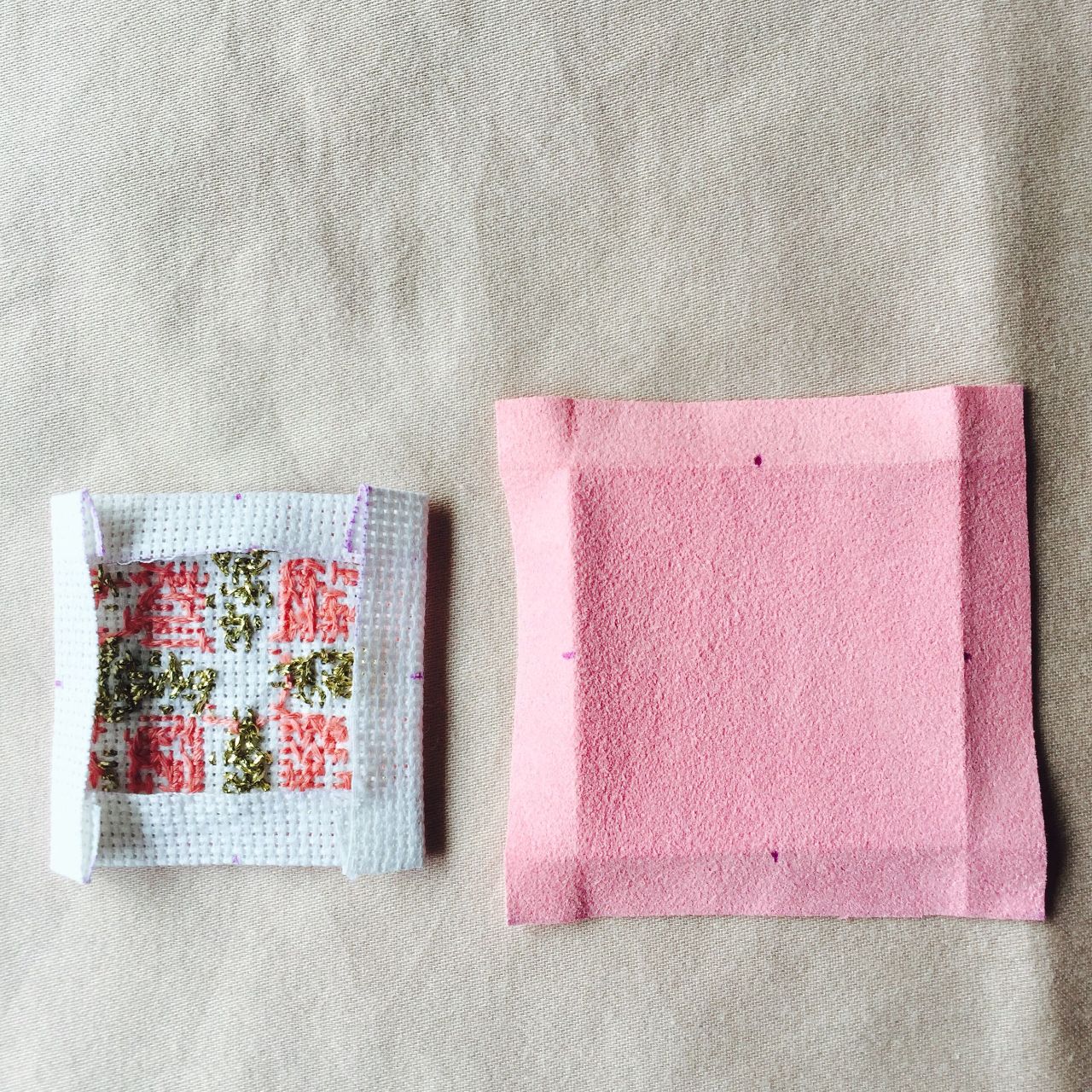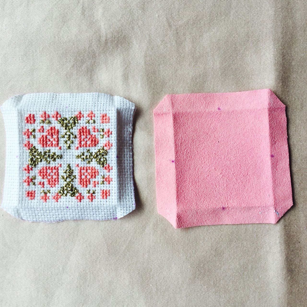 ⑹刺繍布と裏布の縫い代を裏側に折り込み、アイロンをかけておきます。一辺の中心にそれぞれ印がつけておきます。