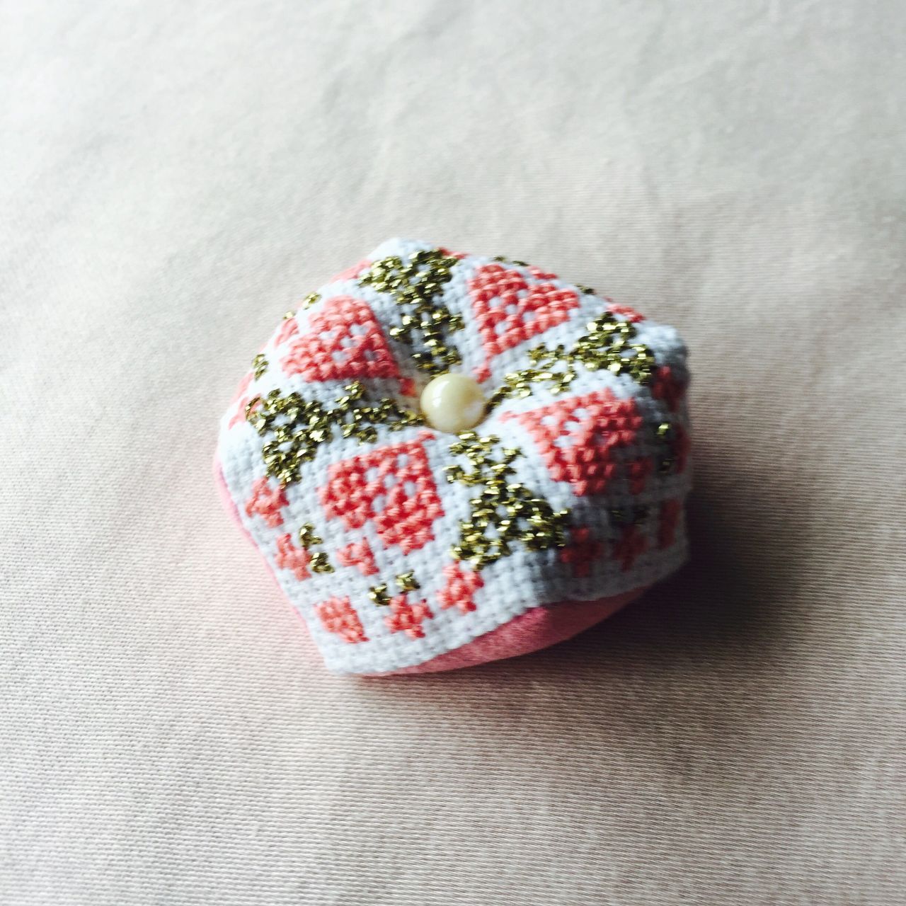 3〜4回引き締めた後に、ビーズを縫い付けます。