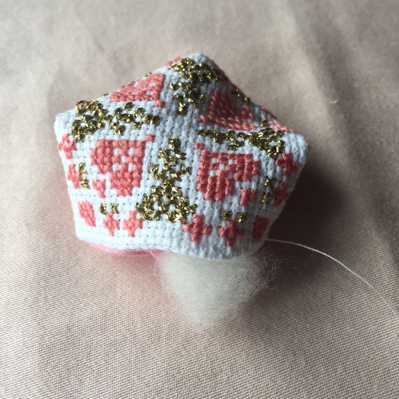 ⑼最後の一辺を残してとじたら、綿を詰めます。