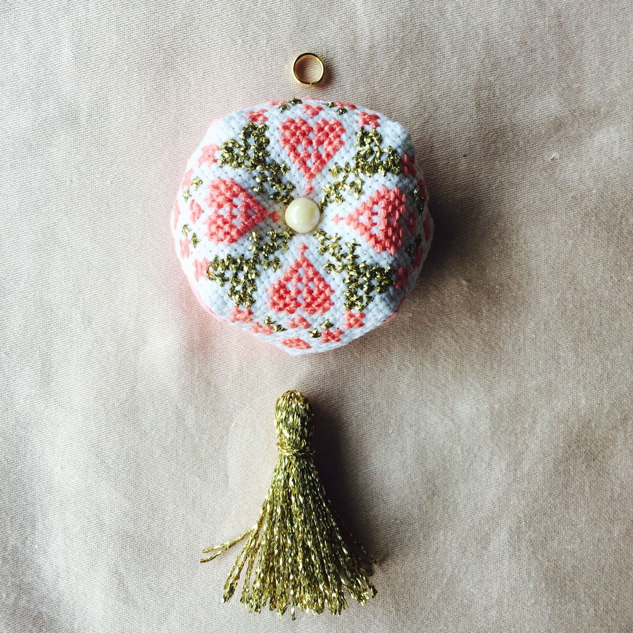 ビスコーニュにタッセルと二重リングを縫い付けて出来上がりです(^o^)