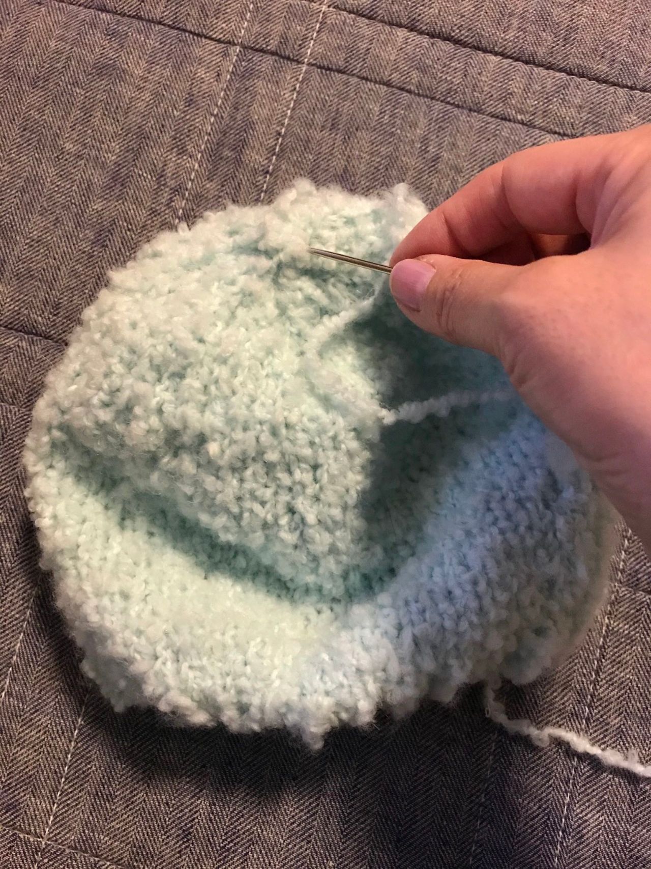 同じ物をもう一つ編み、キャップ本体に縫い付けて出来上がりです!