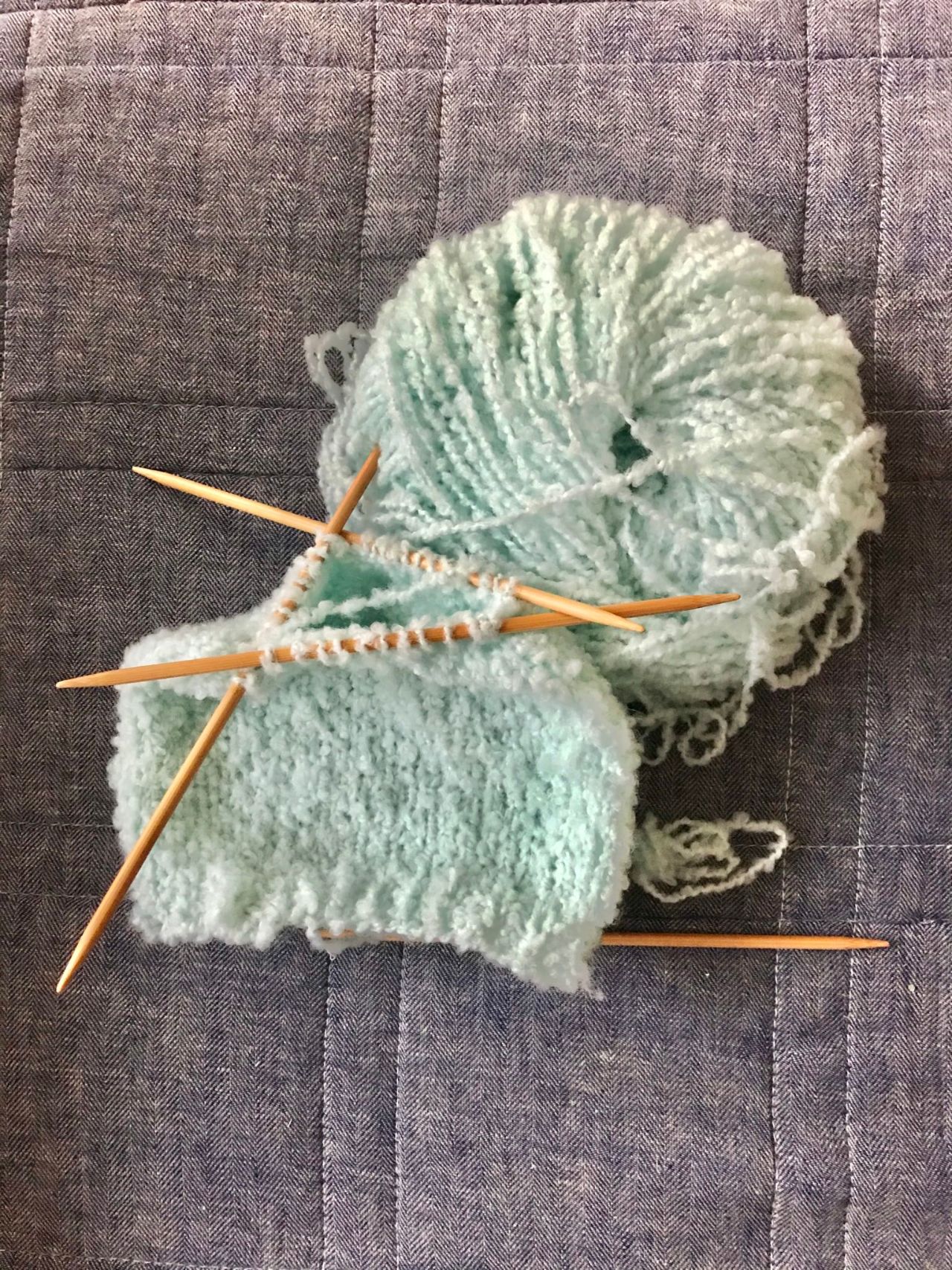 指で掛ける作り目を5目作り、ガーター編みを7段、減らし目をしながらメリヤス編みを2段編み、残りの3目を伏せどめします。