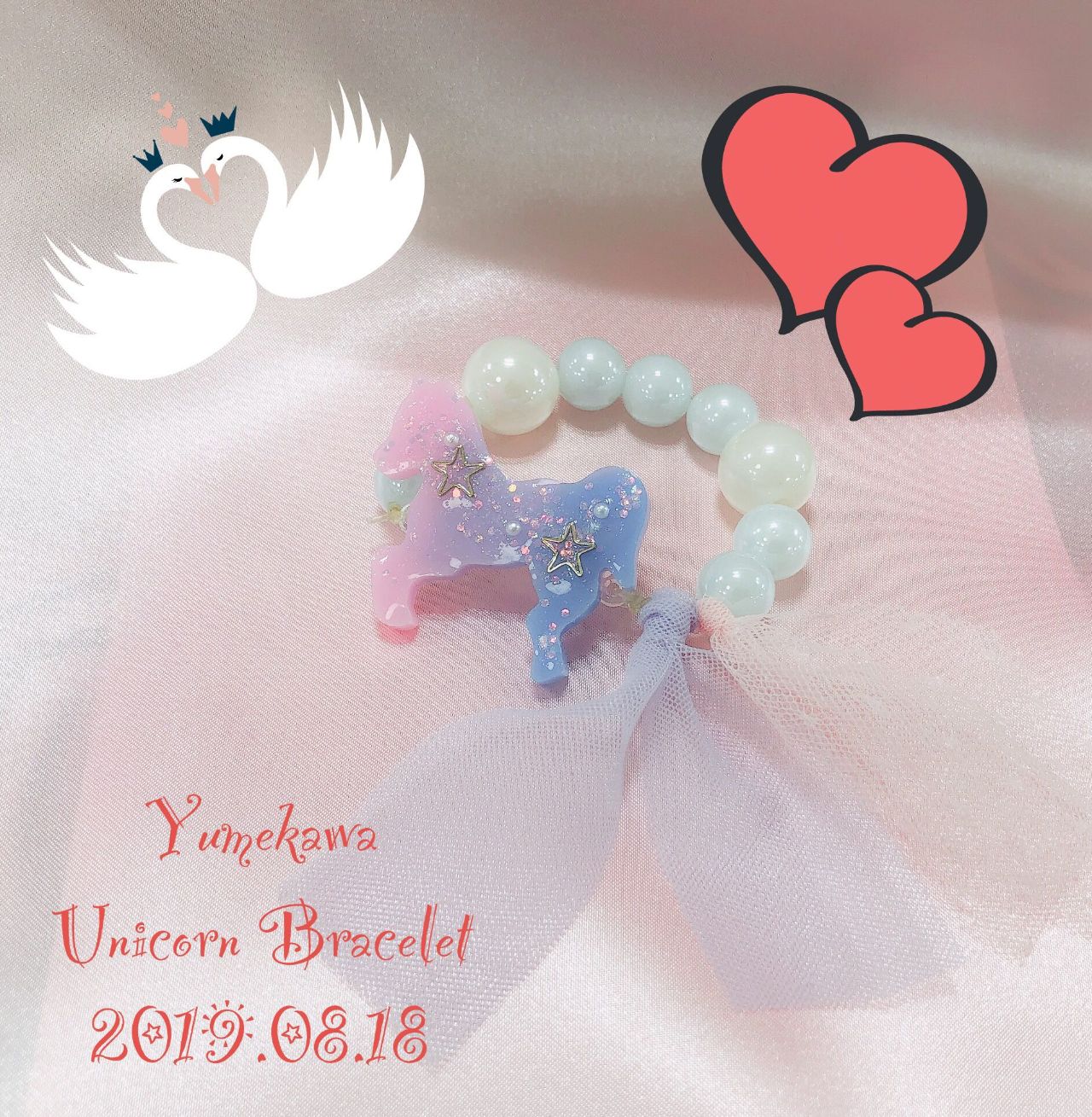 そのユニコーンレジンに大玉でかわいいパールビーズと透け感があってヒラヒラかわいいチュールリボンを組み合わせて ゆめかわ〜♡なゴムブレスを作る講習会になっております!