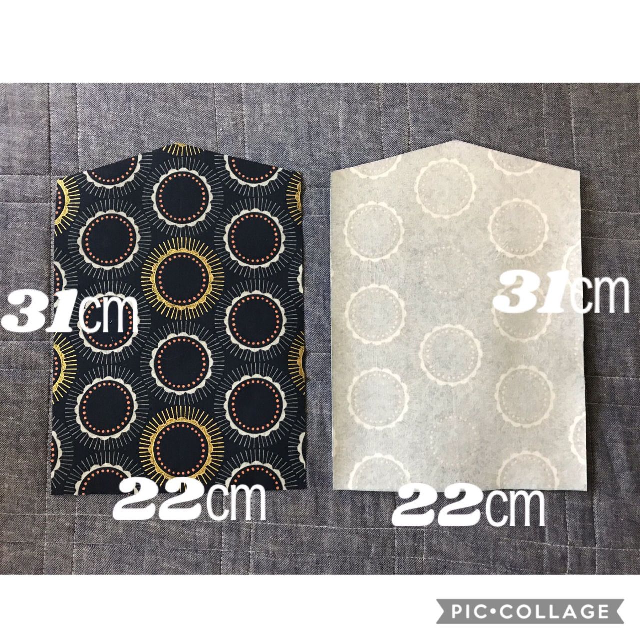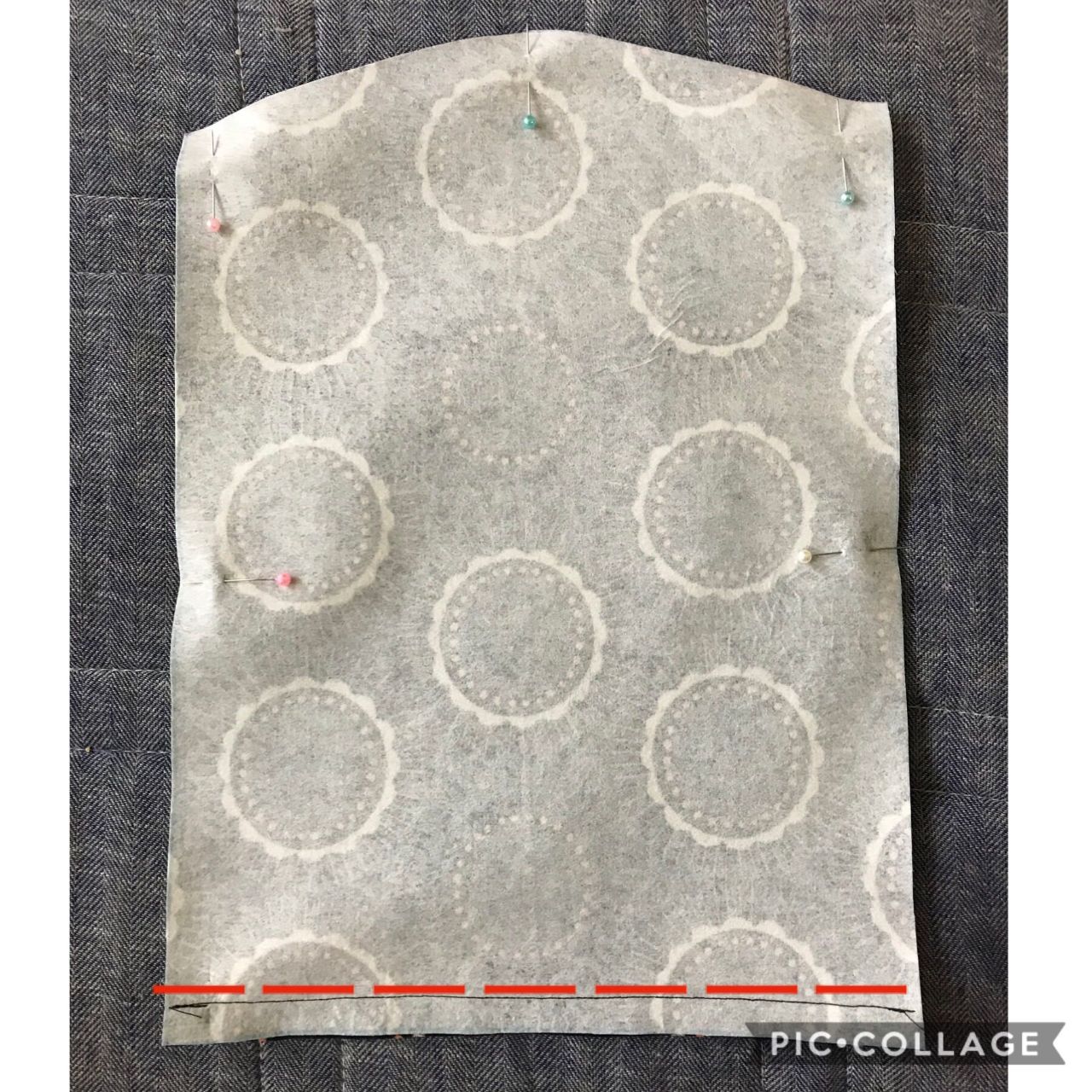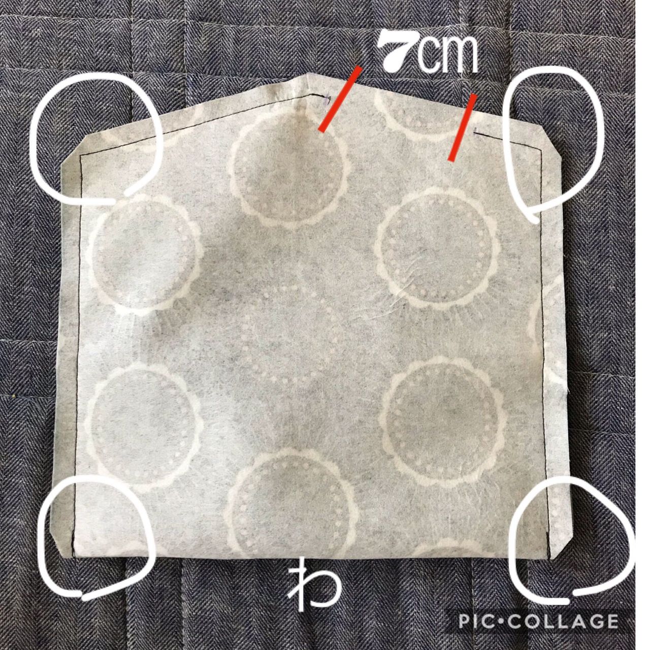 31㎝×22㎝にカット(縫い代込み)してから、上側の角を(詳しいレシピを参照に)三角にカットする。