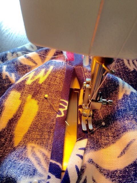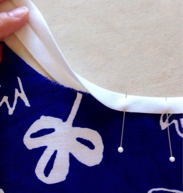 8.合印をあわせて、襟ぐりをバイアステープではさみます。
