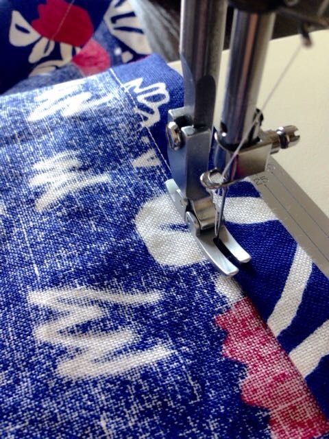 12.裾を縫います。まず最初に1cm折り、さらに2cm折って端を縫います。
