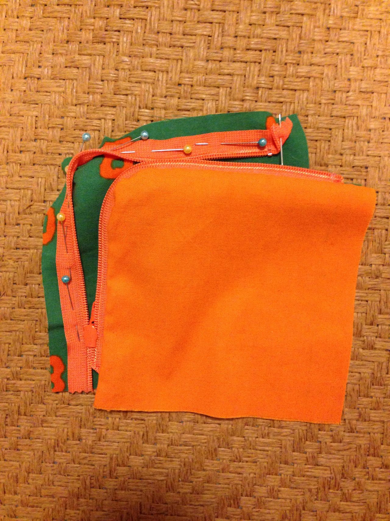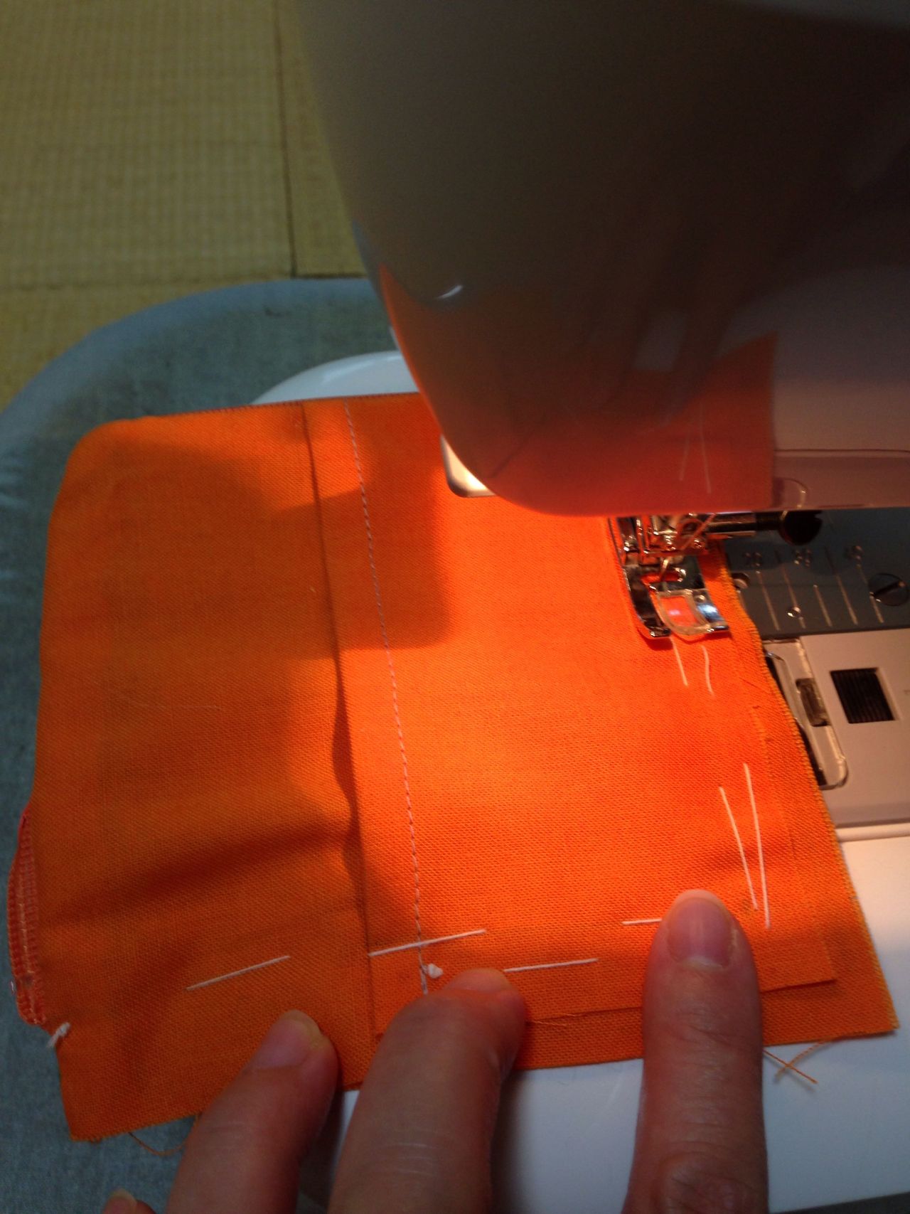 表布同士を中表に合わせて、脇と底を縫います。この時、ファスナーは開けておきます。