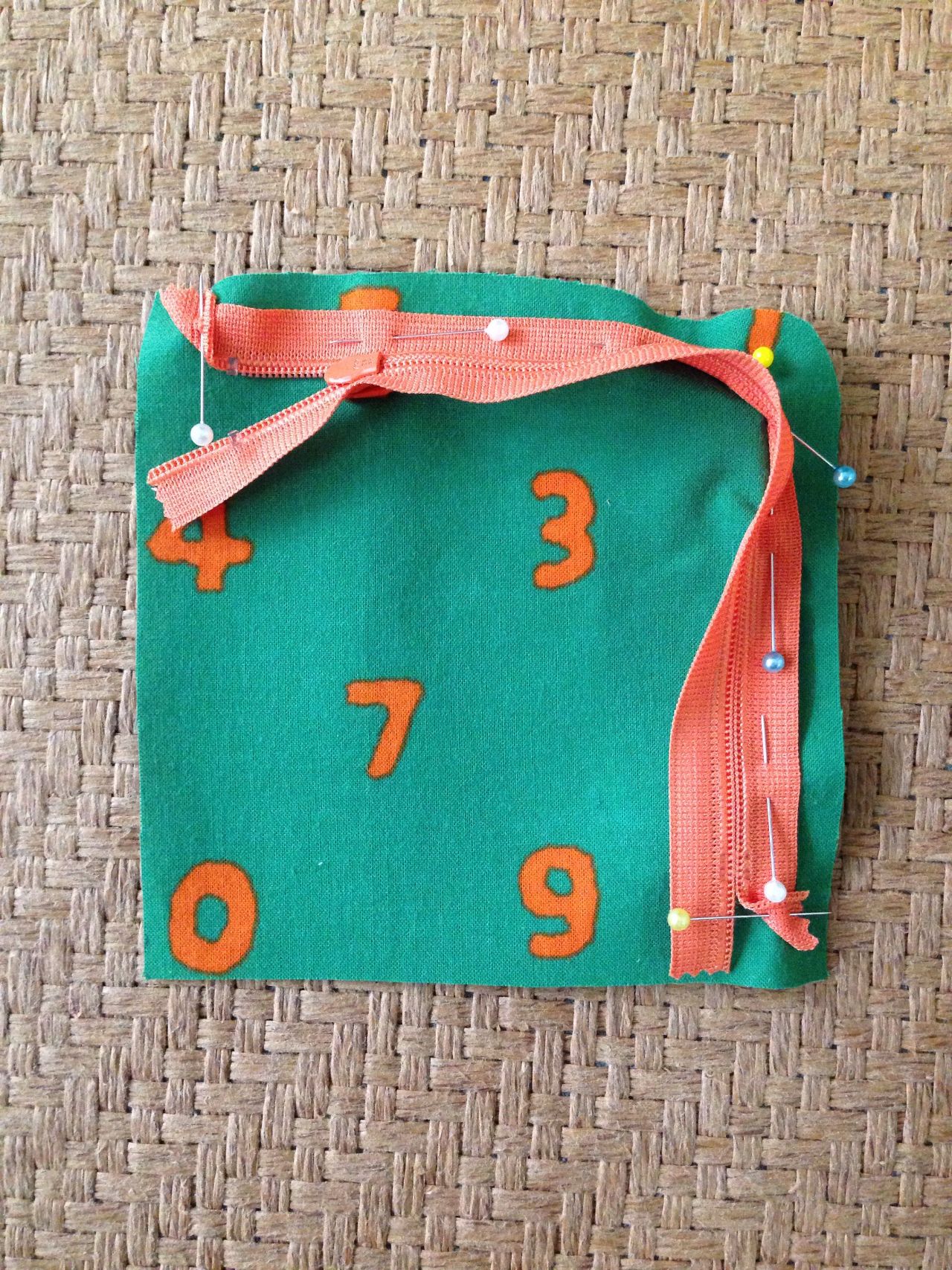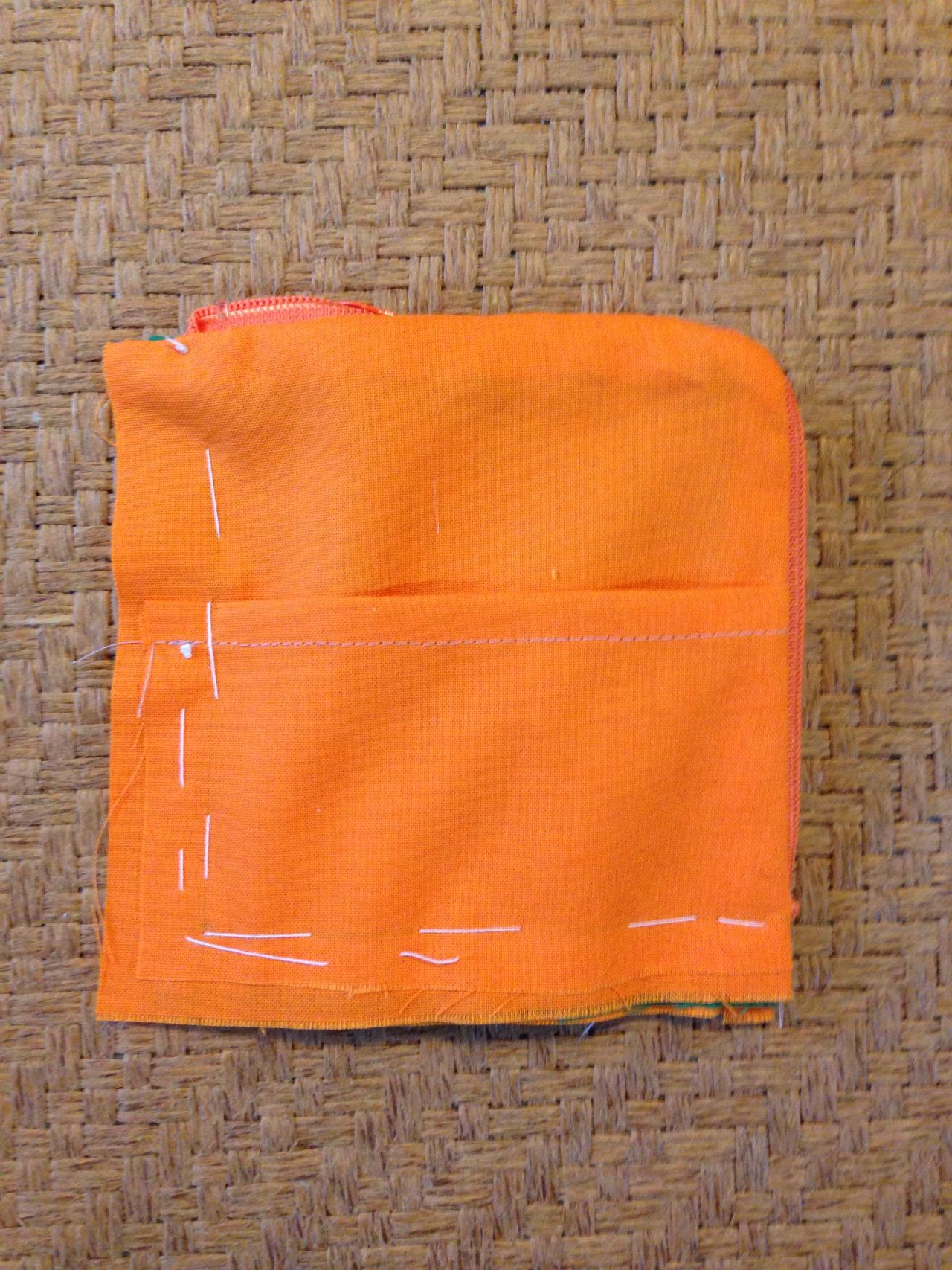 本体表布にファスナーの一方を出来上がりから0.5㎝出るように合わせて仮止めをします。