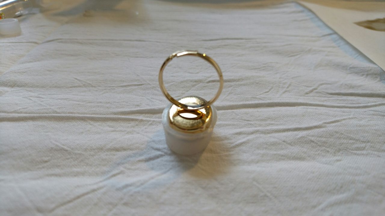裏側に少しレジン液をたらし、そこにリングをつけてUVランプで5分程硬化させます。