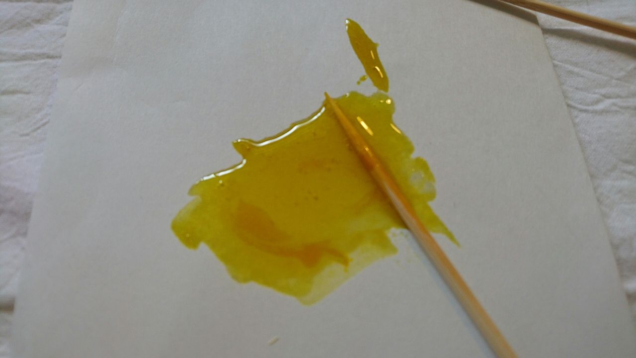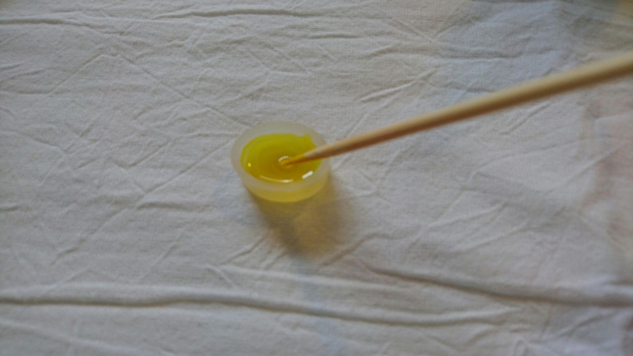 最初にレジン液に黄色のヴィトラーユ絵具を2~3滴加えて混ぜていきます。紙などの上で竹串かようじでまぜるとキレイに混ざります。