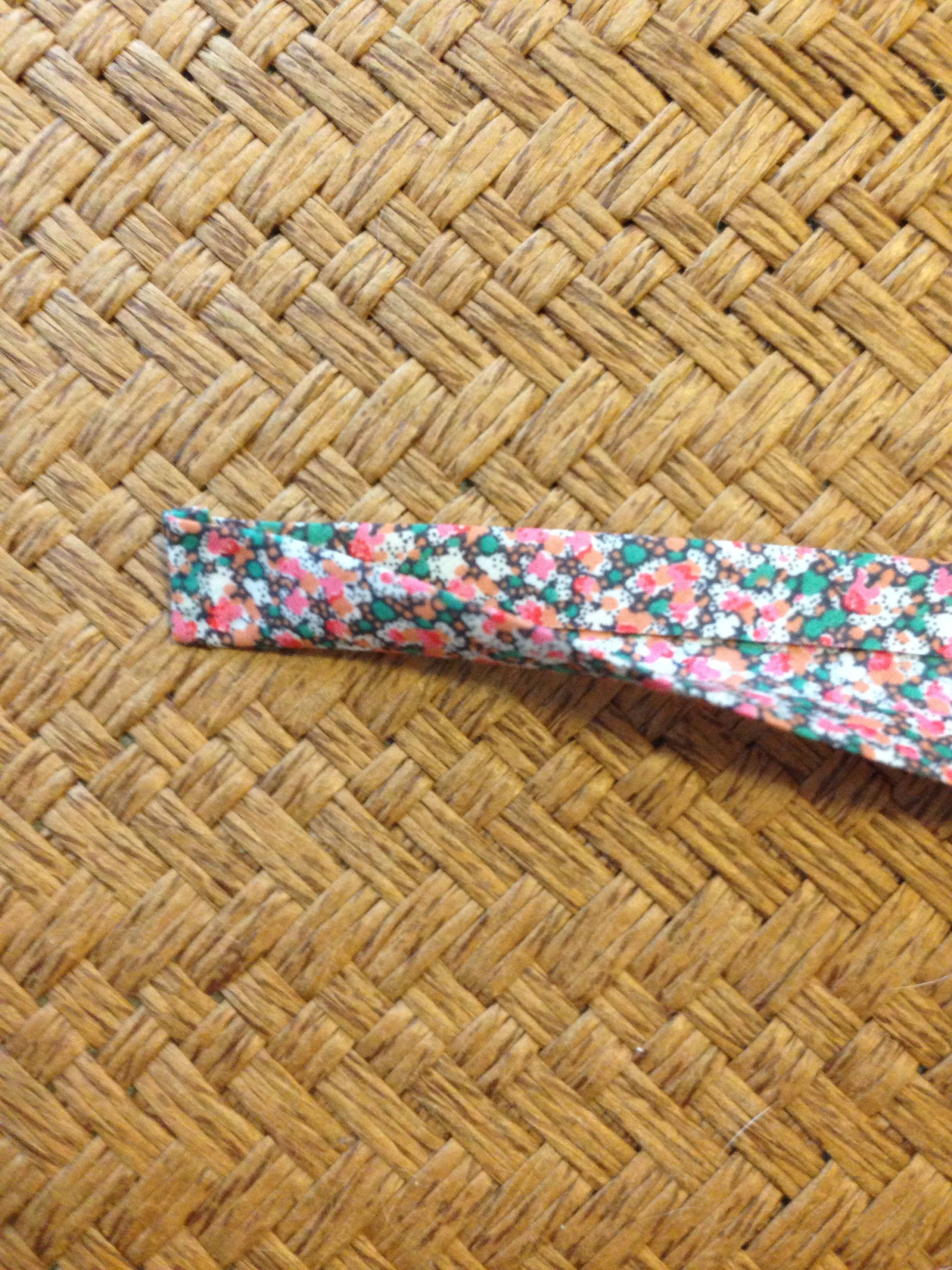 ②リバティバイアステープの両端にボンドをつけ、5mm内側に折り込みます。