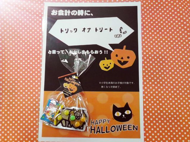 もうすぐハロウィン!ということで、調布店では17日より小学生未満を対象にお菓子のプレゼントを実施致します(^-^)/