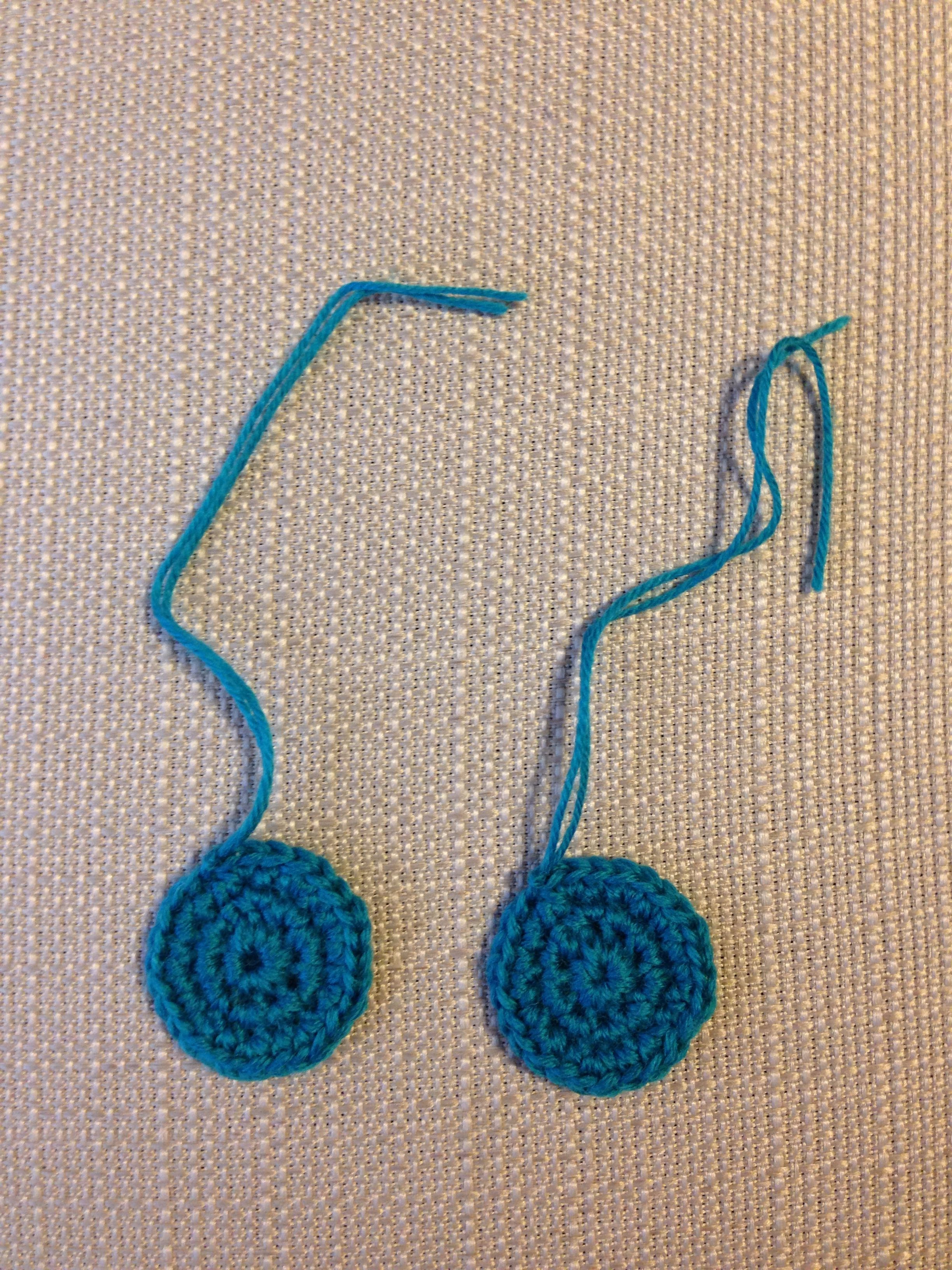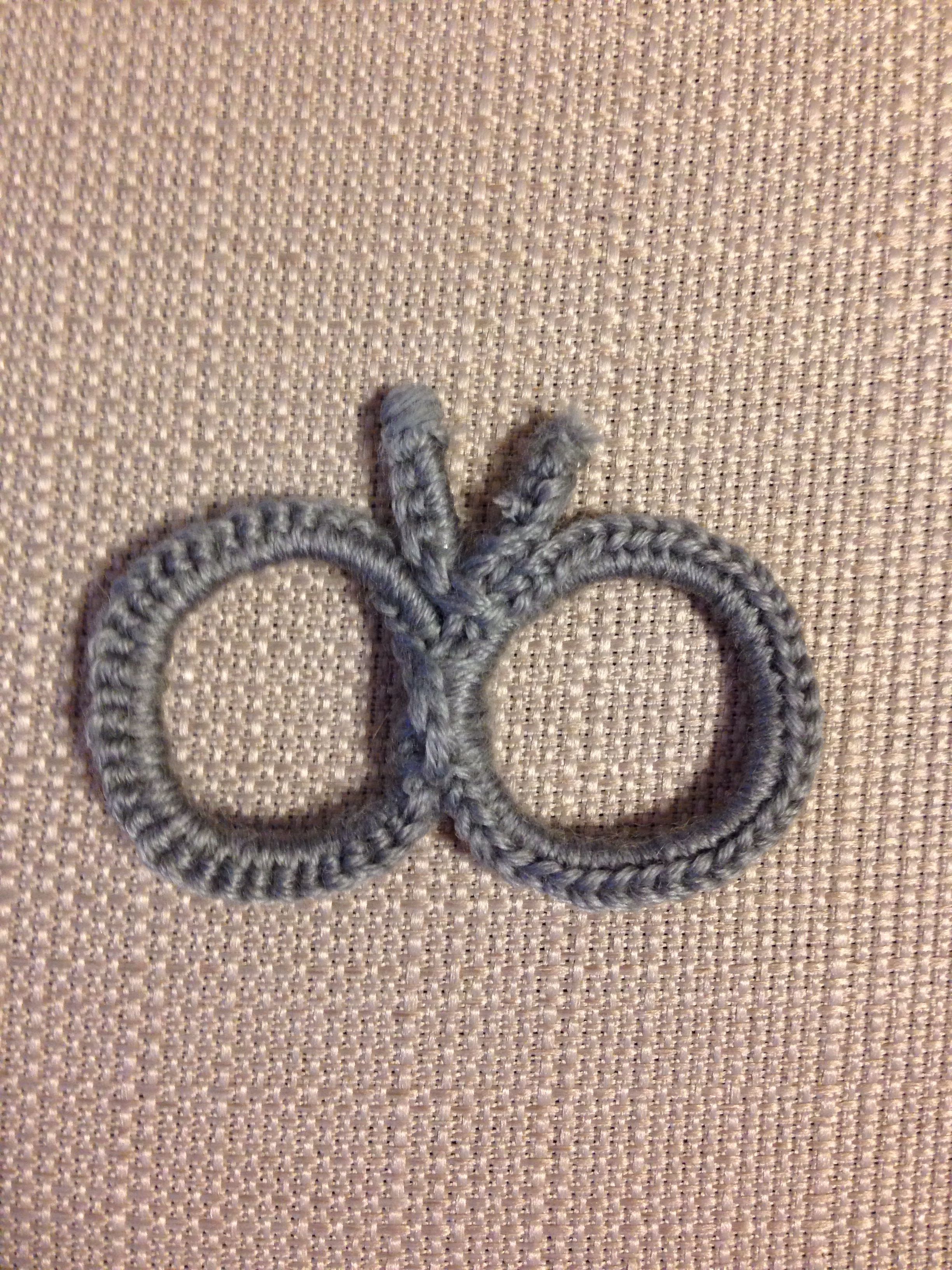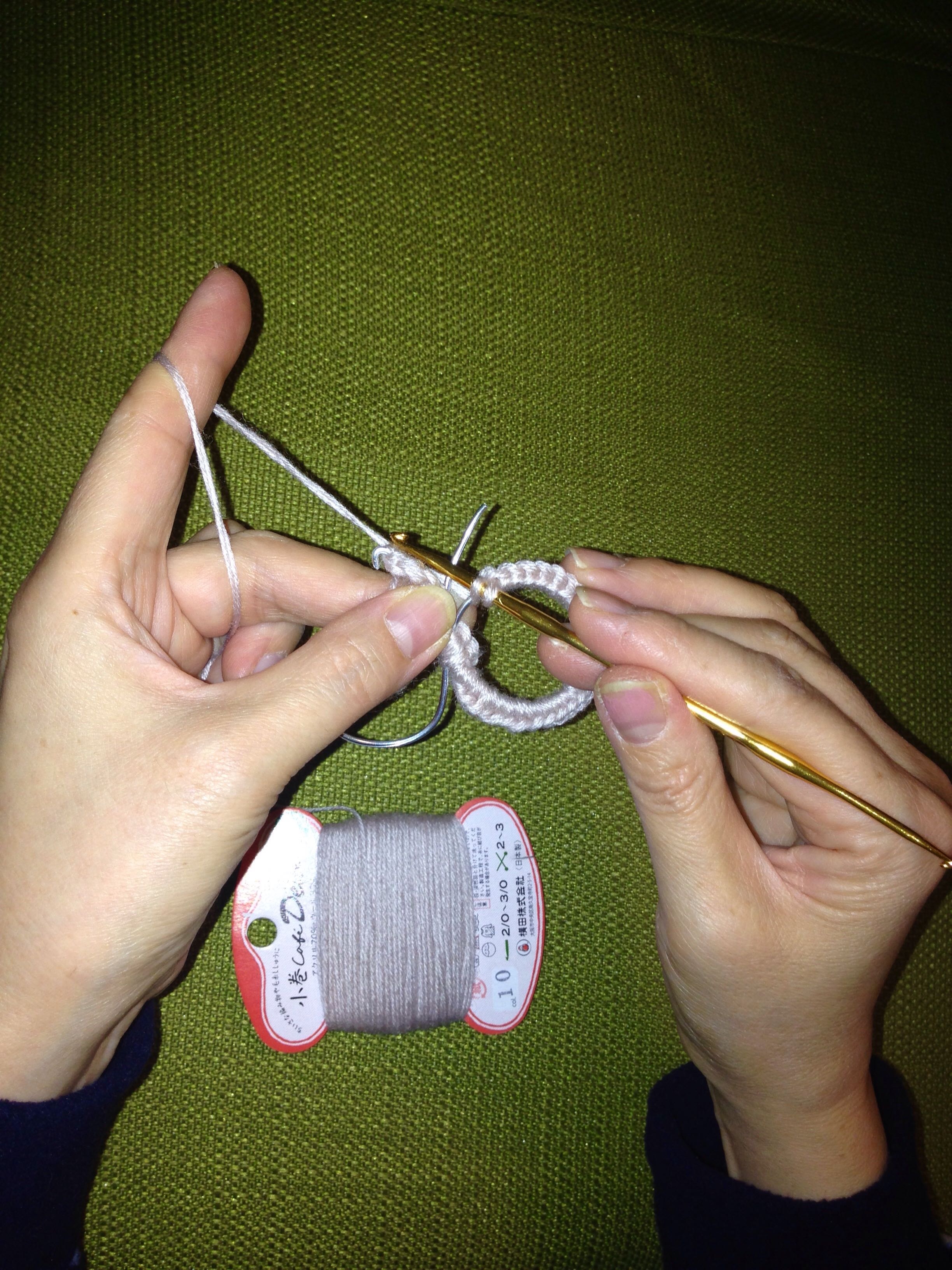 ③2本どりで糸端を輪にして羽を2枚編みます。(縫いつけ用に糸を残しておきます)