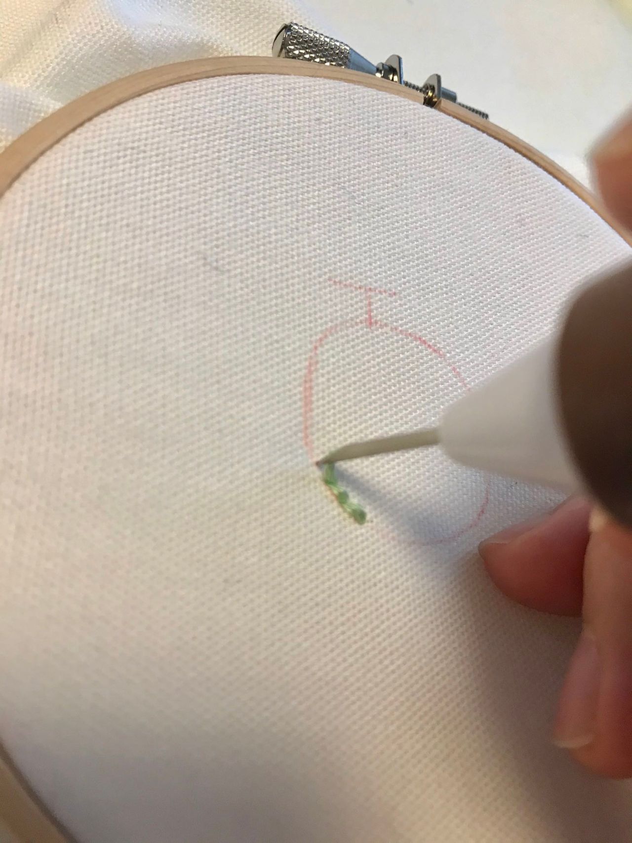 茎の部分を、ストレートステッチで刺繍し、メロンの出来上がりです♬