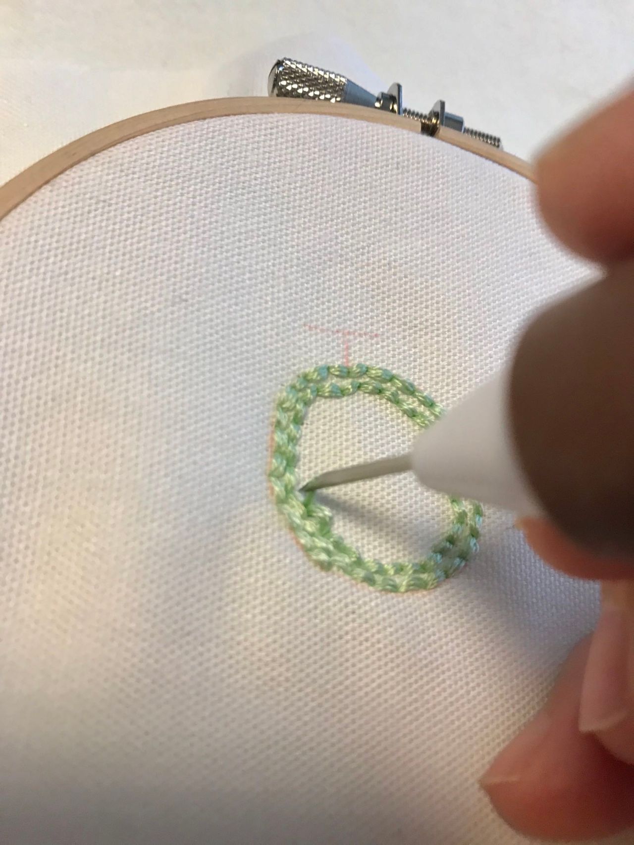 ④ ステッチの幅は、針の太さくらいを目安に、針の横穴が後ろ側にくる様に、繰り返し輪郭を刺し進めます。